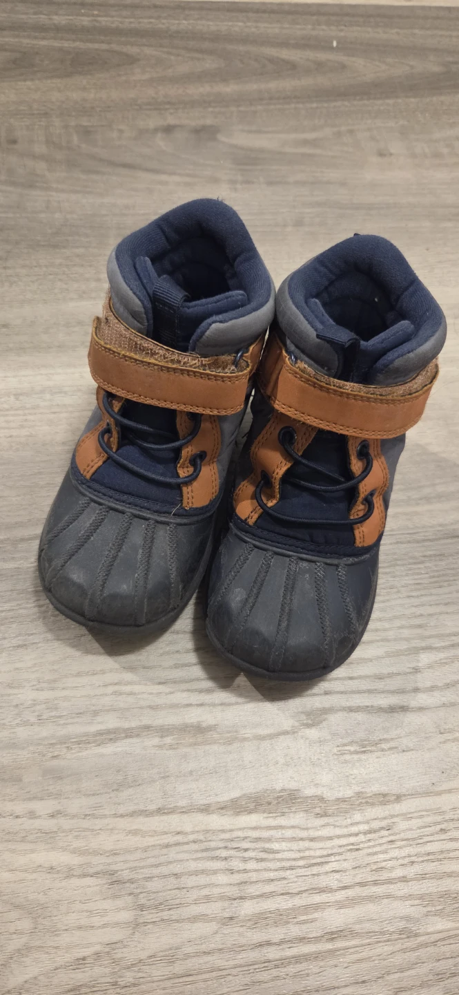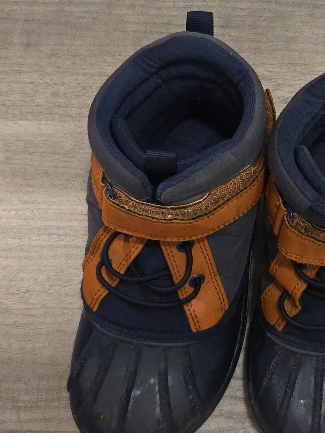 These toddler winter boots are in good condition and ready for some snowy adventures! They feature a classic duck boot design with a navy and orange colour scheme. Perfect for keeping little feet warm and dry this winter