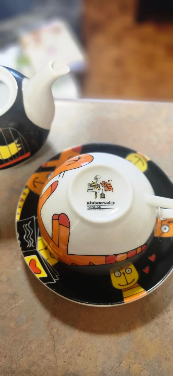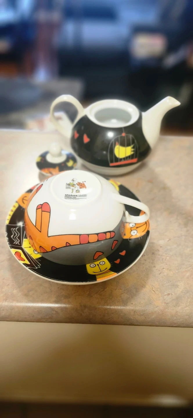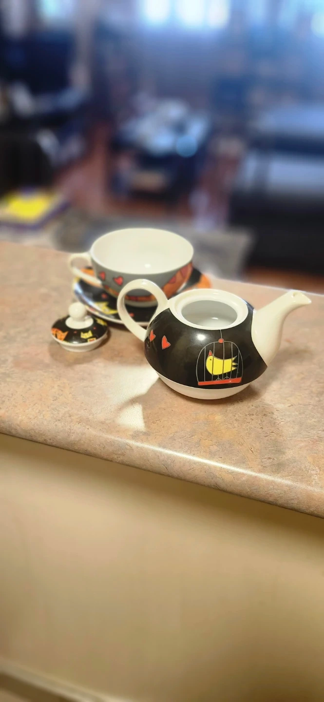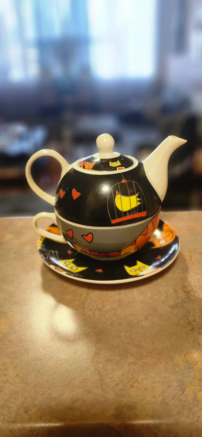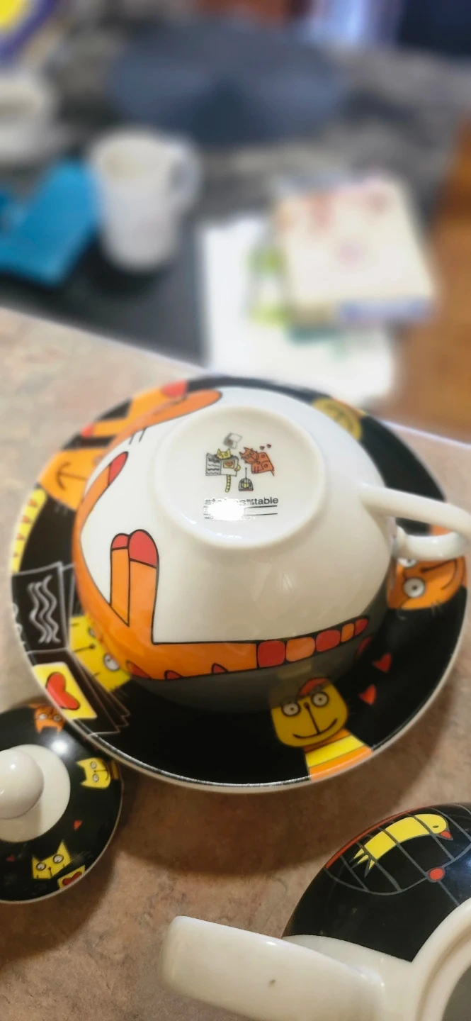 This charming teapot and cup set features a playful cat design. It's made from durable porcelain. Perfect for a cozy afternoon tea!