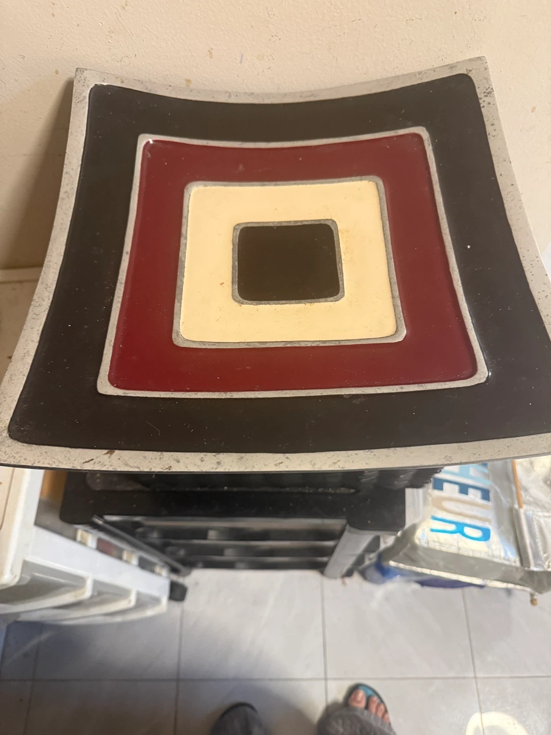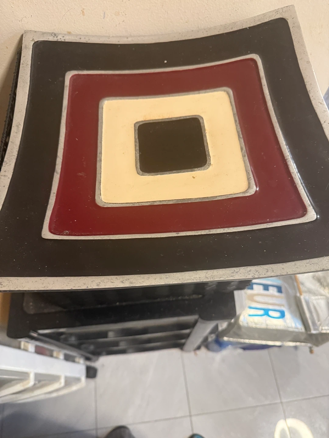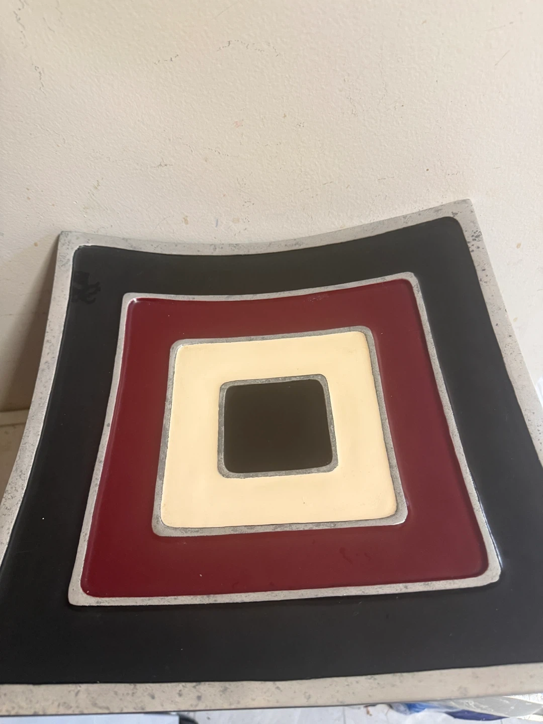 A decorative square dish with a concentric square design. Features bold black, burgundy, and cream colours with a metallic silver trim. It's a stylish accent piece for any table or shelf. Measures approximately 12 inches by 12 inches.