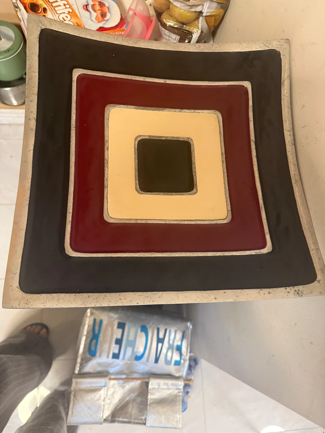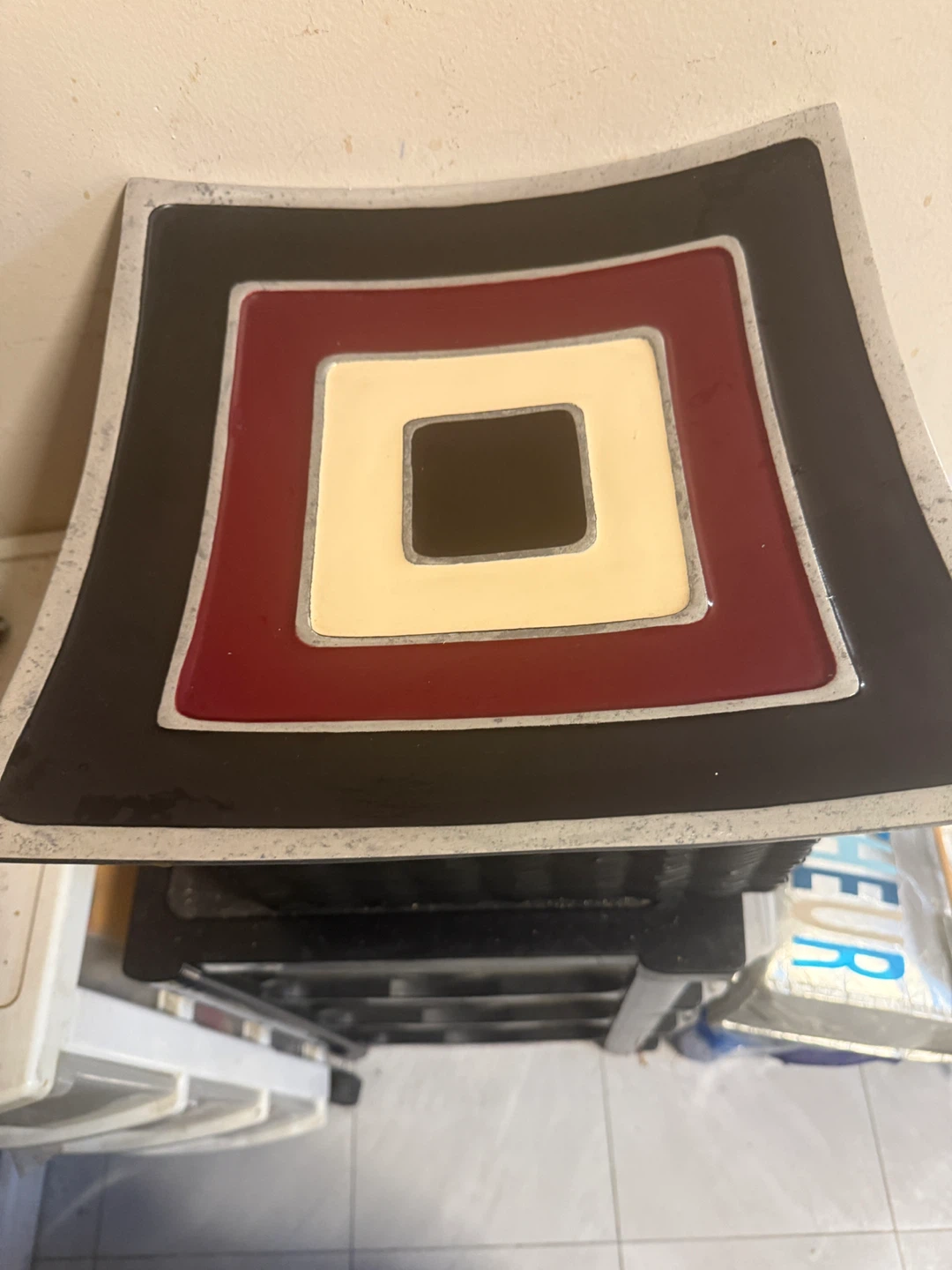A decorative square dish with a concentric square design. Features bold black, burgundy, and cream colours with a metallic silver trim. It's a stylish accent piece for any table or shelf. Measures approximately 12 inches by 12 inches.