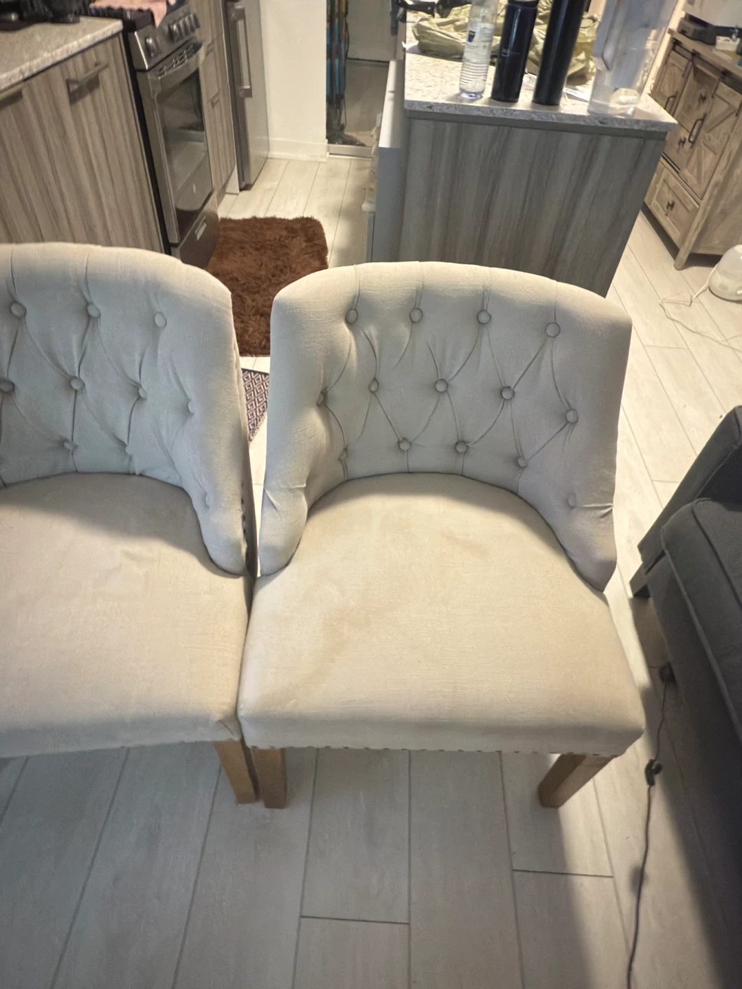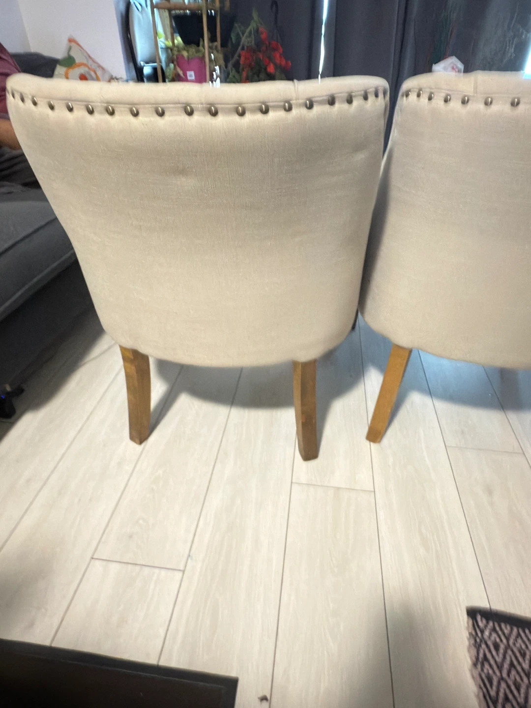 Selling a set of two accent chairs. They have a beige fabric and wooden legs. The chairs have a tufted back design and nailhead trim. They're in good condition and would look great in any living space