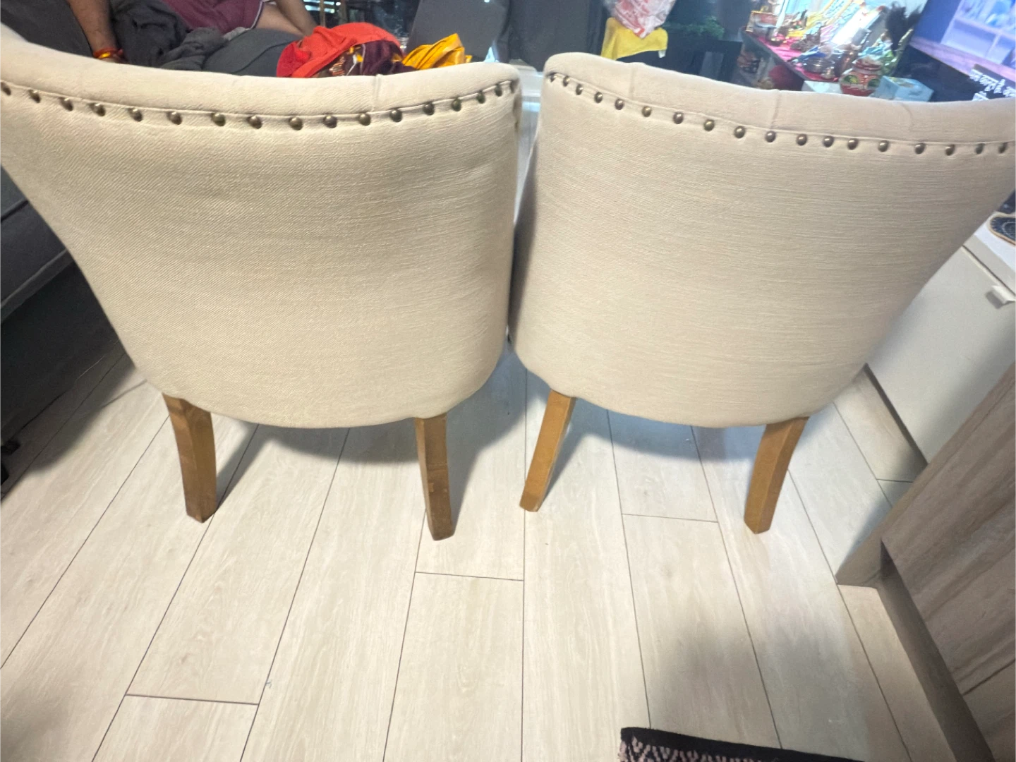 Selling a set of two accent chairs. They have a beige fabric and wooden legs. The chairs have a tufted back design and nailhead trim. They're in good condition and would look great in any living space