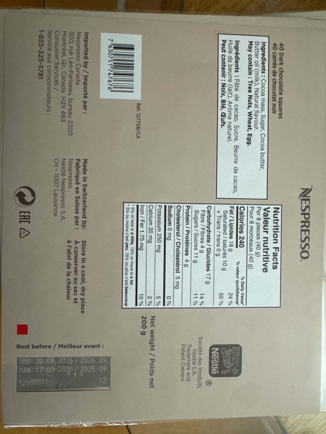 Buy & SellNespresso Dark Chocolate Squares (200g)Nespresso Dark Chocolate Squares (200g)$1040 Nespresso Dark Chocolate squares. Made with cocoa mass, sugar, and butter oil. Best before 30/09/2025.ConditionNewWHERE TO MEET325 Bogert AveView MapSELLERverifiedMimiLansing1317 reviews0 chats·2 favorites·10 viewsSEND CHAT TO SELLERHi Mimi! I’m interested in your listing.Hi Mimi! I’m interested in your listing.Get the Karrot app to chatSign In to chat
