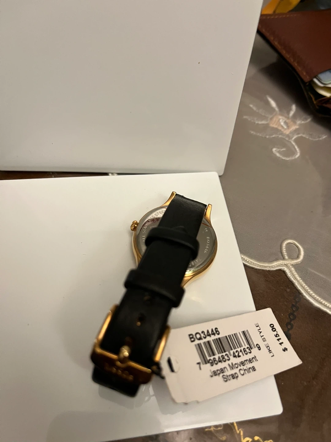 Fossil BQ3446 watch with a gold-tone case and black leather strap. Japan movement and strap made in China. Original price was $115.00.