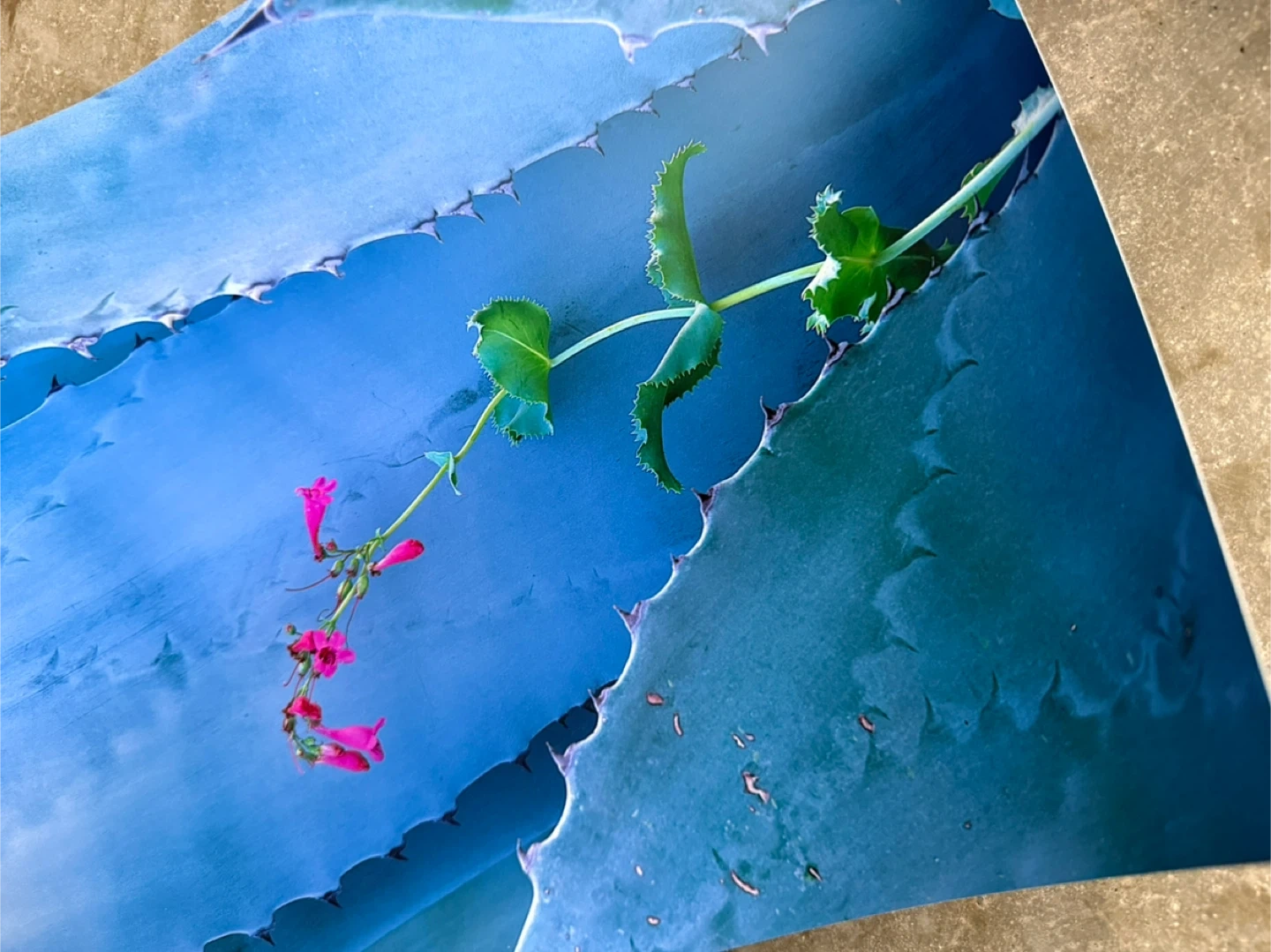 Beautiful art print featuring a close-up of an agave plant with a delicate pink flower. The colours are vibrant blue and green. It's a stunning piece for any home decor. This print would brighten up a living room or office space. Size 12x16 inch.