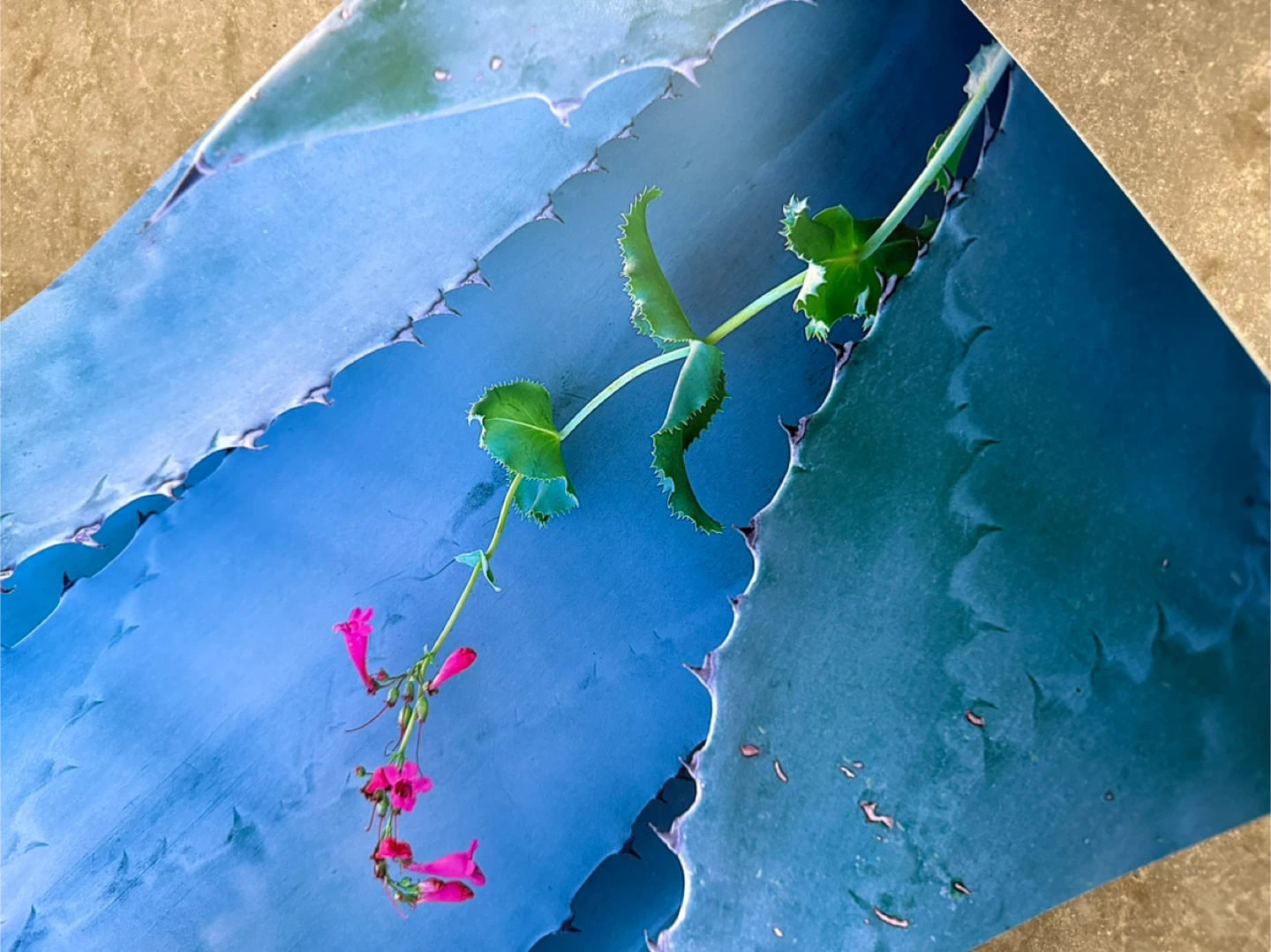 Beautiful art print featuring a close-up of an agave plant with a delicate pink flower. The colours are vibrant blue and green. It's a stunning piece for any home decor. This print would brighten up a living room or office space. Size 12x16 inch.