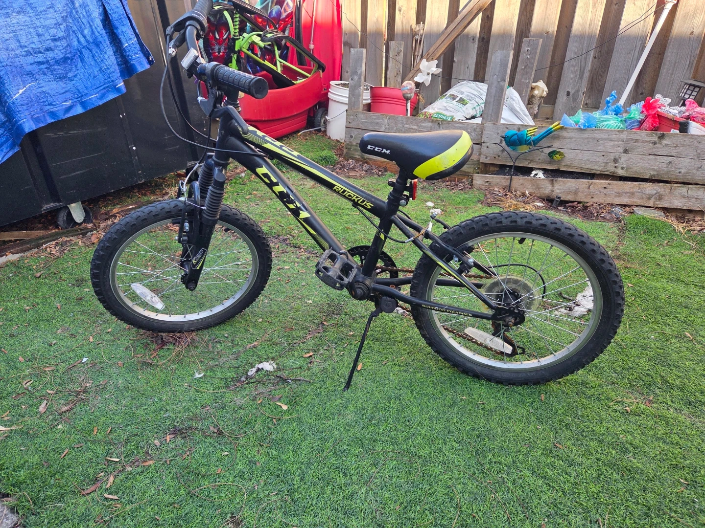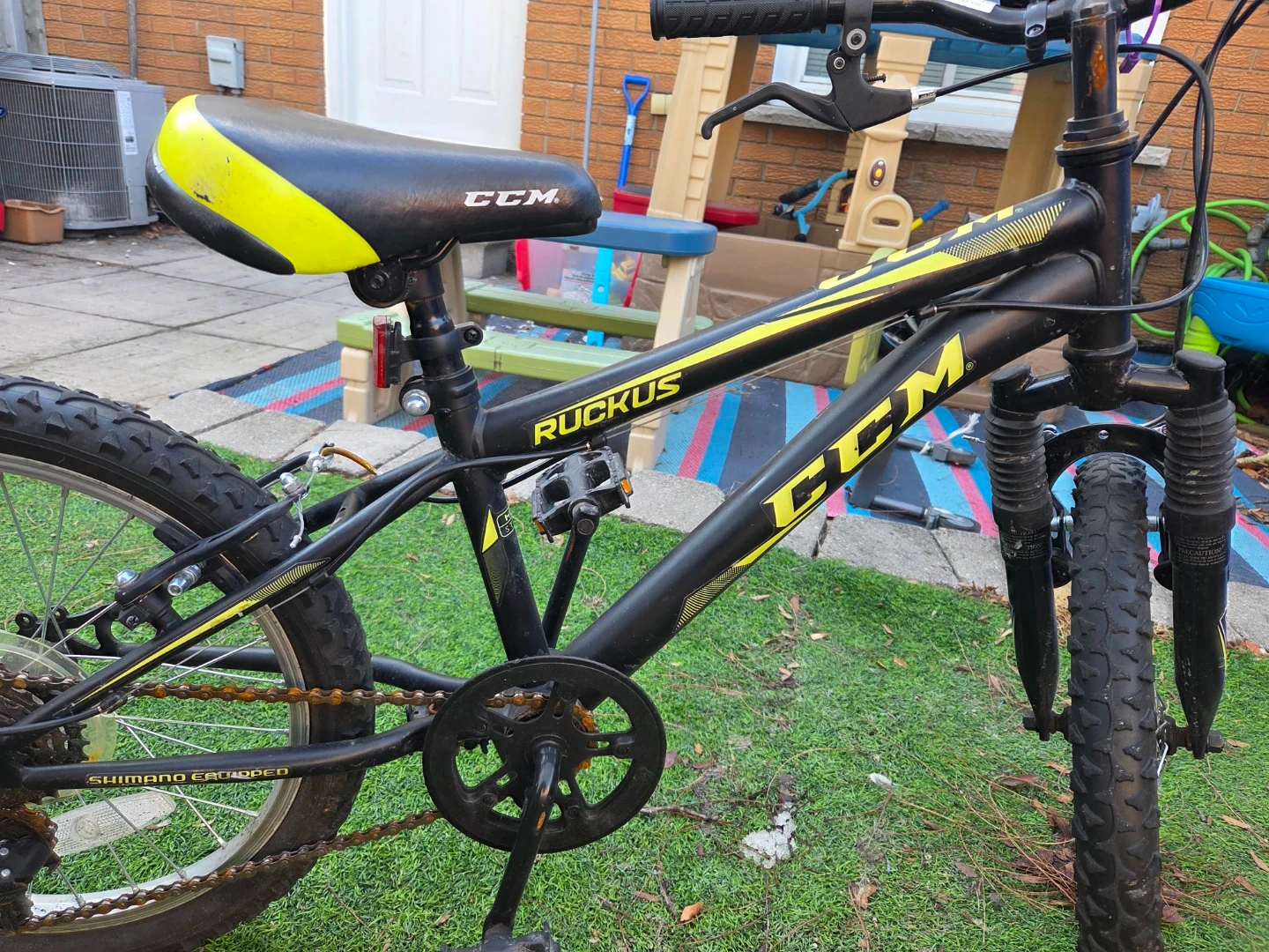 This is a CCM Ruckus kids' bike. It's black with yellow accents. Features front suspension and a comfortable seat. Great for getting around!