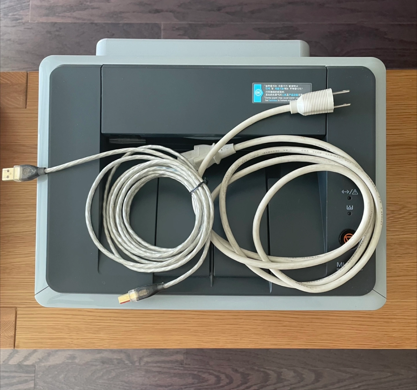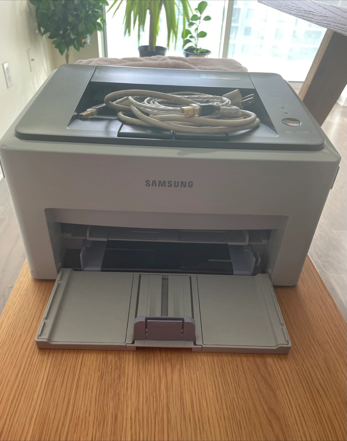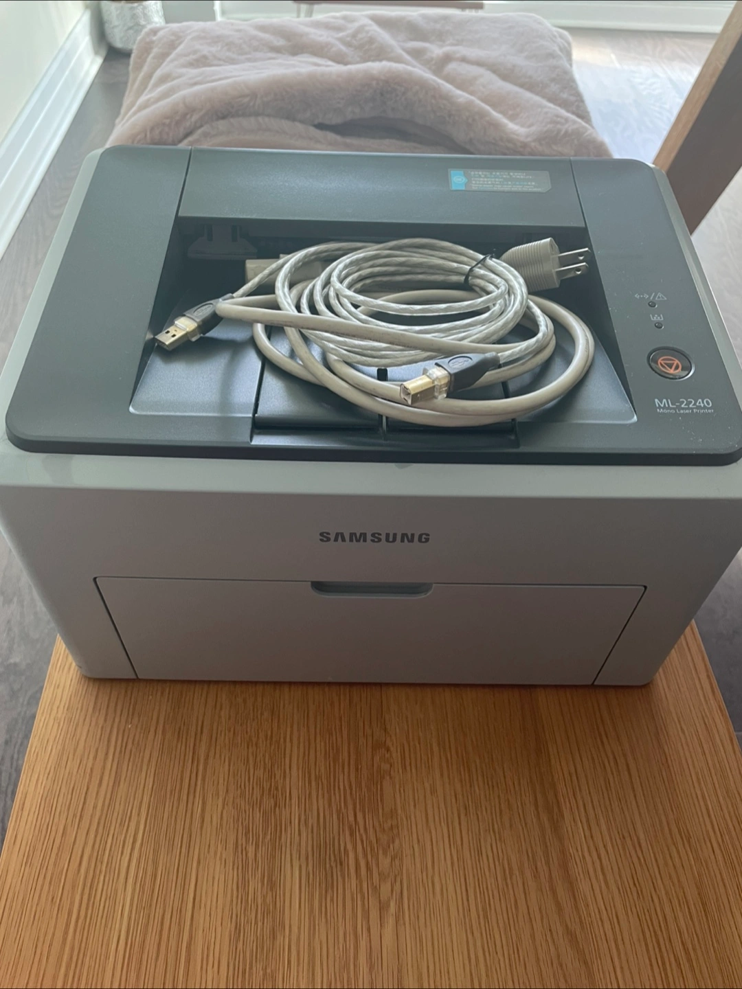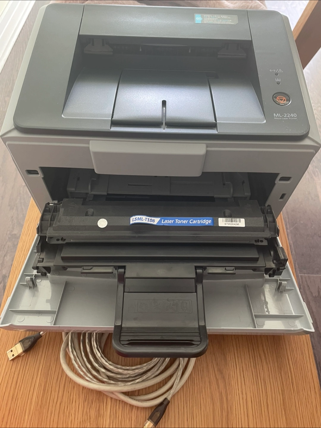 Monochrome laser printer. Includes power cord and USB cable (no wireless connection). Toner cartridge included. Model ML-2240. Prints black and white only, paper cover not included.