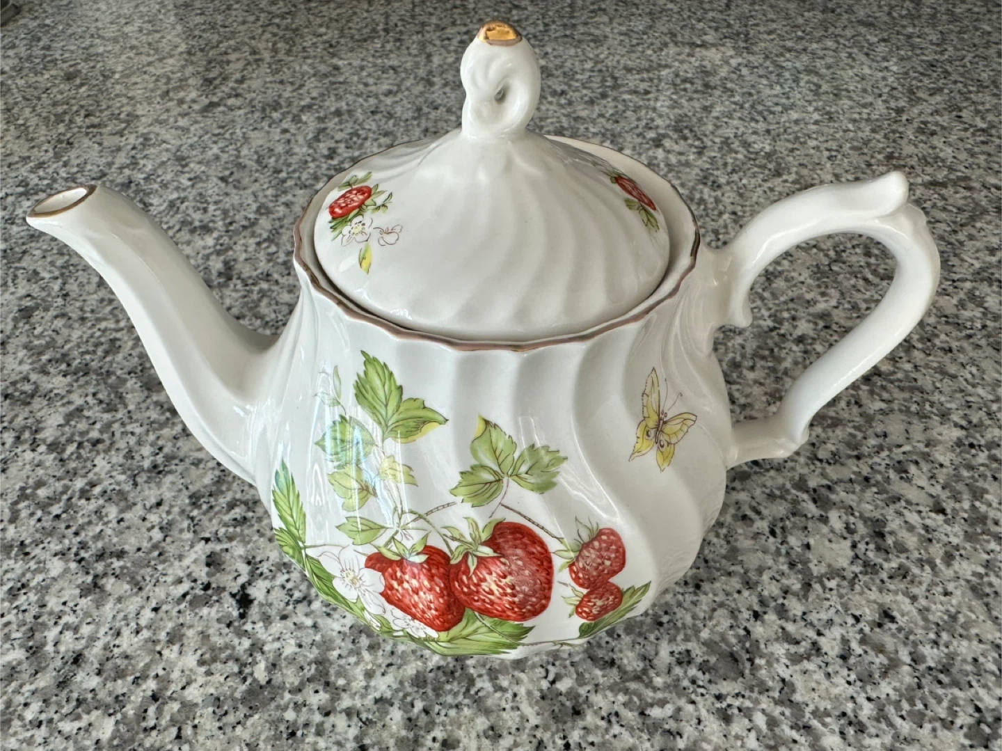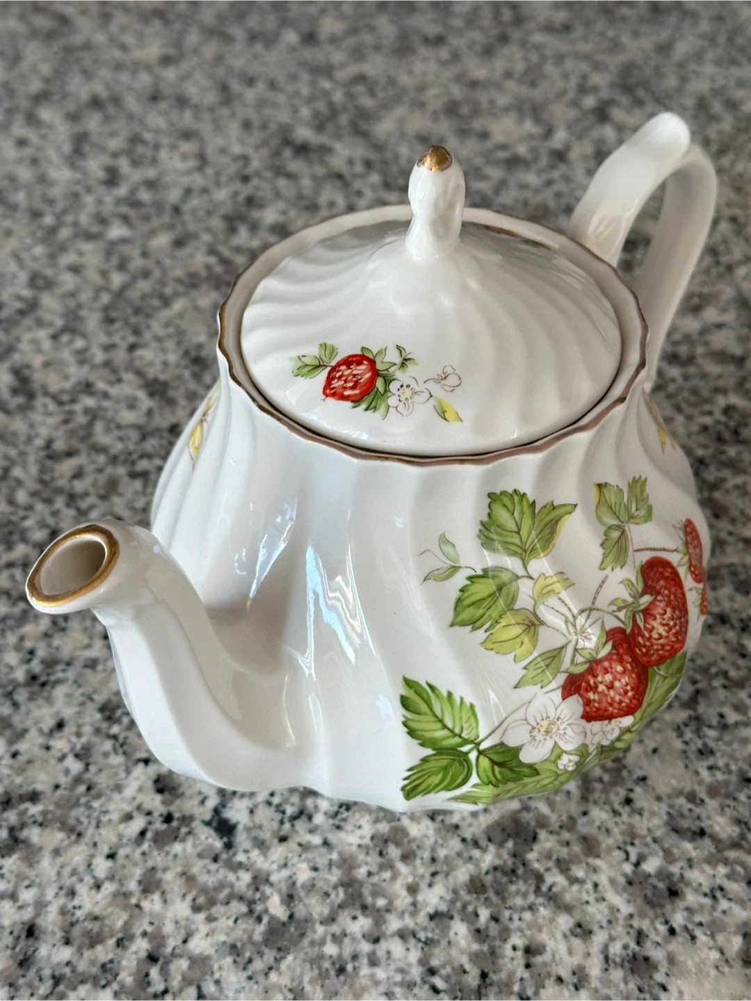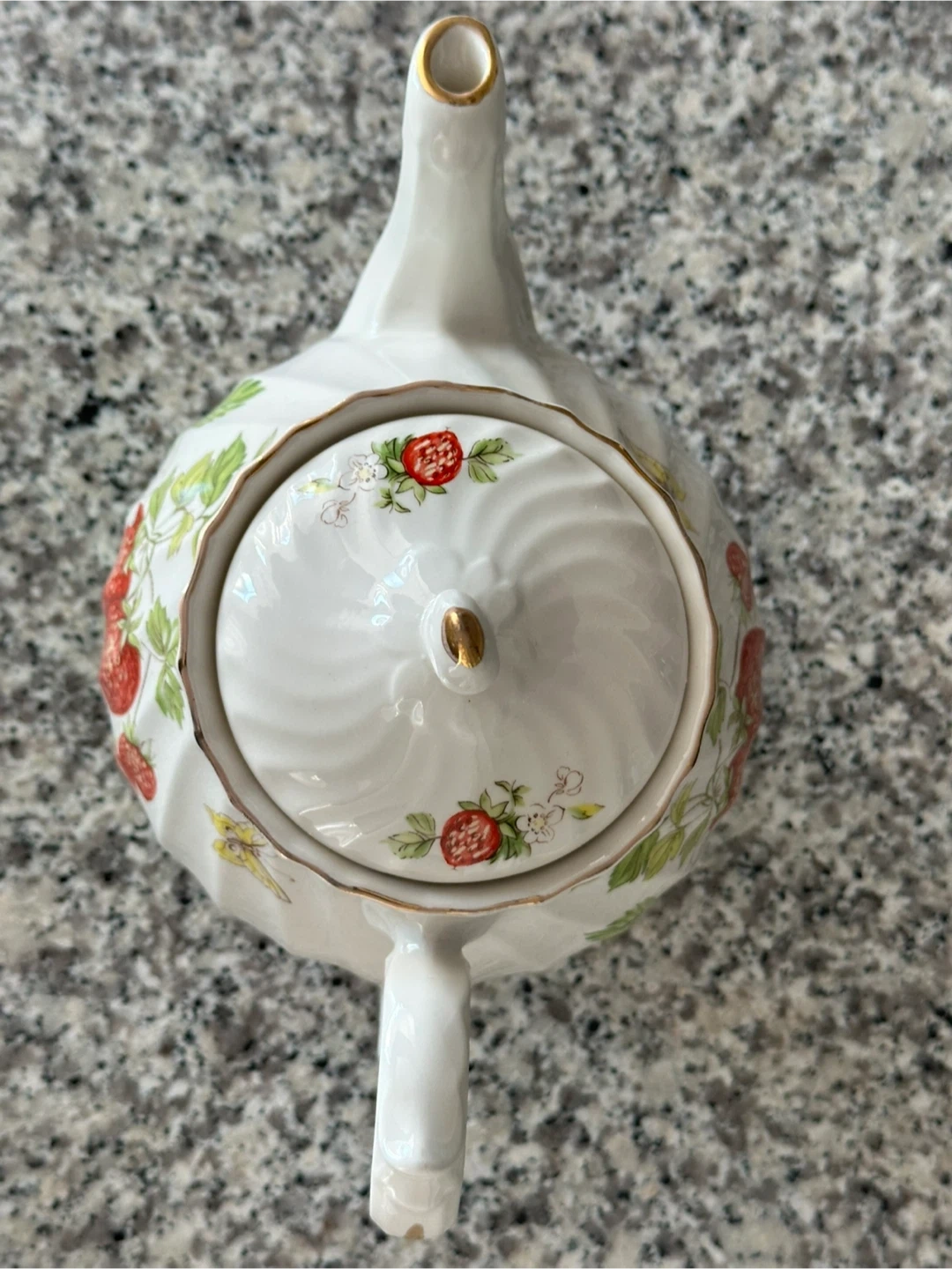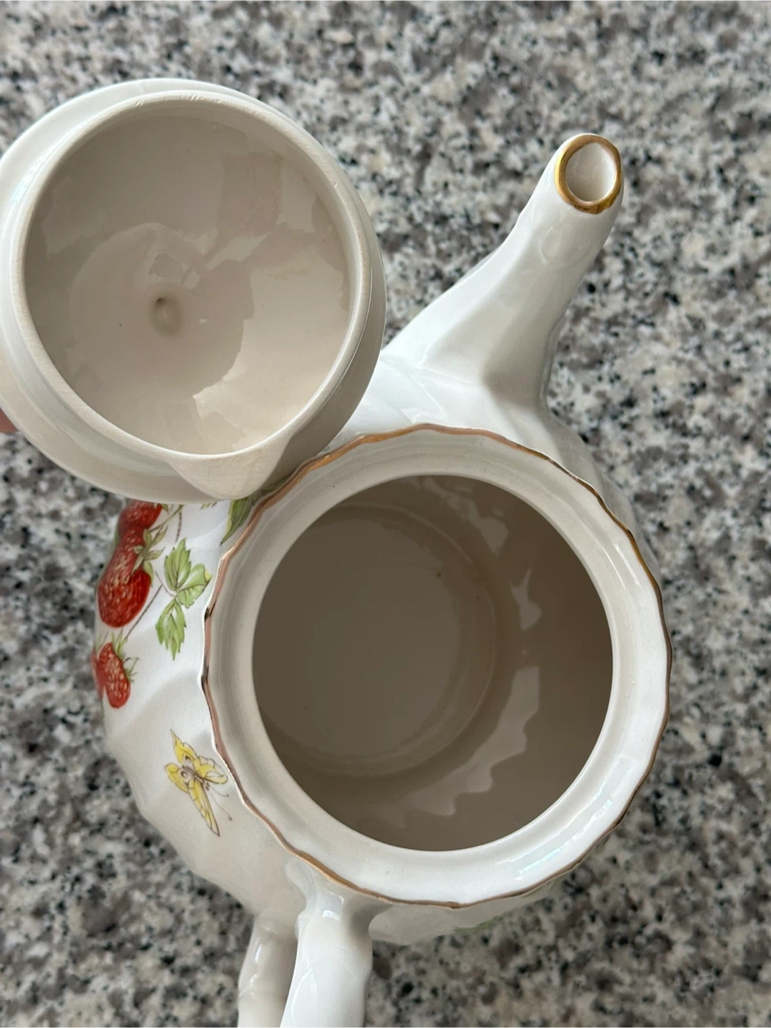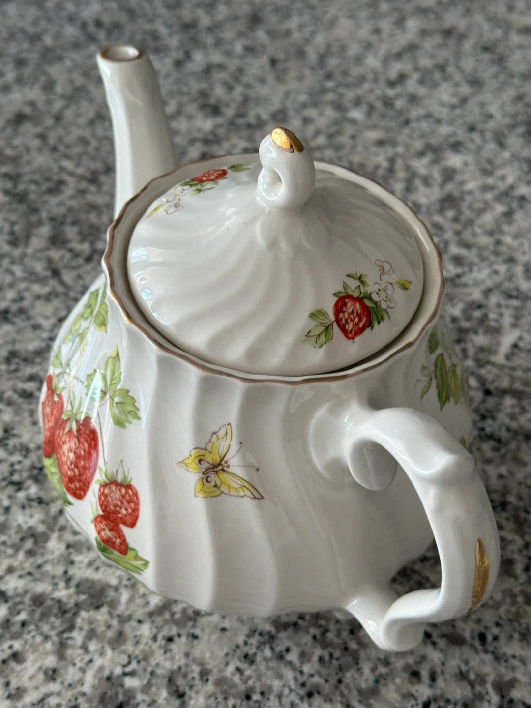 Here's a lovely vintage teapot, complete with its lid! It features a charming strawberry and butterfly design, perfect for adding a touch of whimsy to your tea time. The teapot is in great condition and ready to be enjoyed