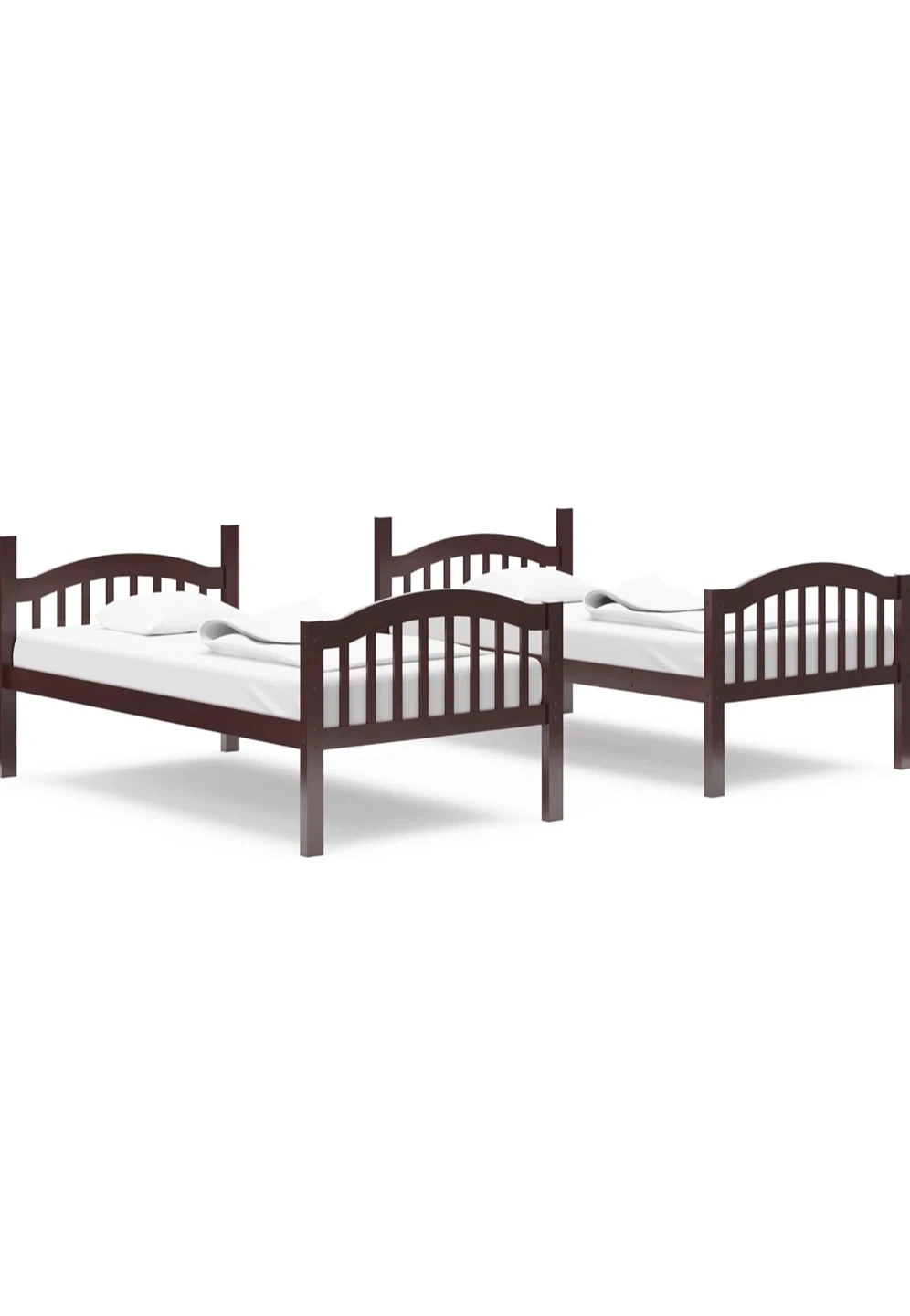 Dark brown wooden bunk bed. Solid wood construction. Includes ladder for top bunk access. It's a space-saving solution for kids' rooms. Great for families with multiple children.