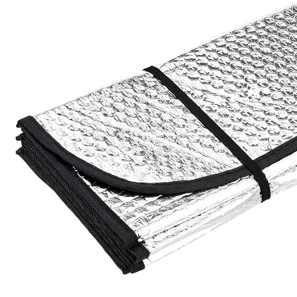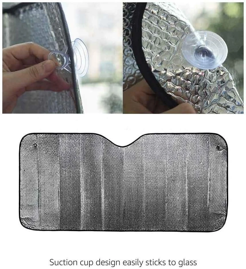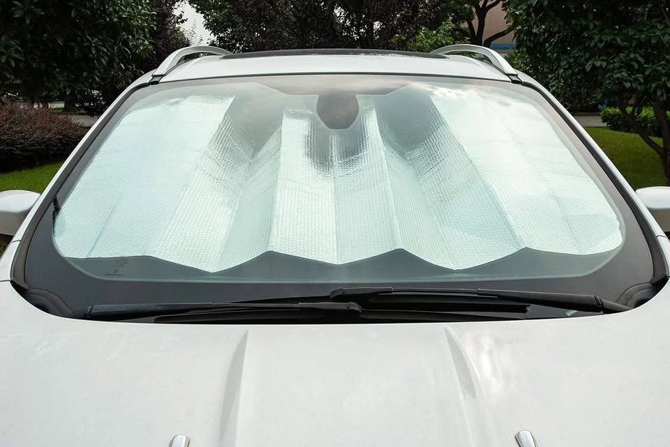 Amazon Basics UV Reflecting Foldable Sun Shade. MSRP $25 on Amazon. Size: 57 in × 26 in (145 cm × 66 cm). Thickness: 2 mm reflective material with aluminum coating for maximum heat deflection. Easy to fold and store — creases into a compact shape when not in use. Ideal for most sedans, SUVs, and pickups (front windshield). Helps prevent sun damage to interior (dash, seats, electronics). Great for harsh Canadian winter sun.