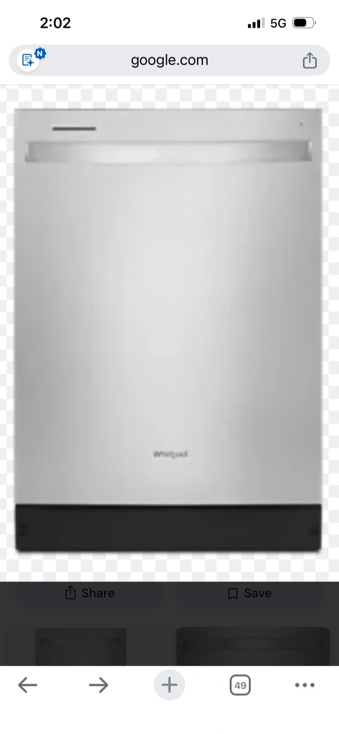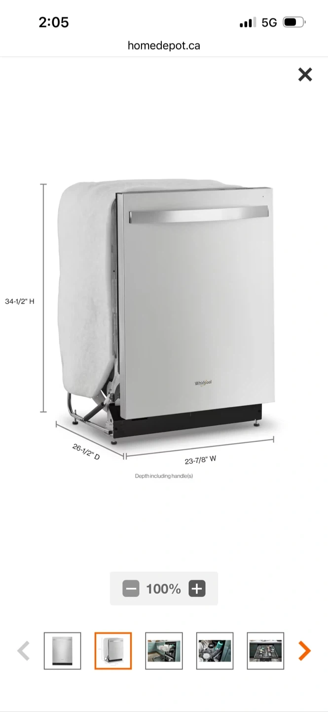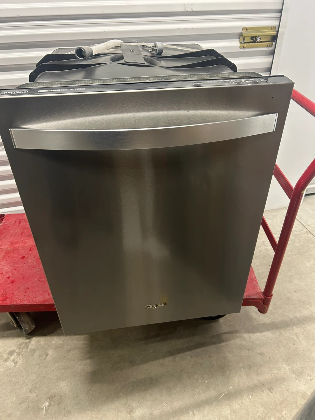 New Whirlpool stainless steel dishwasher. It's a standard-sized unit with a spacious interior. Dimensions are 34-1/2" H x 26-1/2" D x 23-7/8" W.