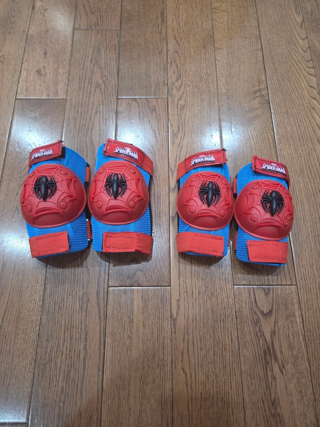 This set includes Spider-Man themed elbow and knee pads for kids. They're designed with blue fabric and red protective shells featuring the iconic Spider-Man logo. Straps adjust for a snug fit.