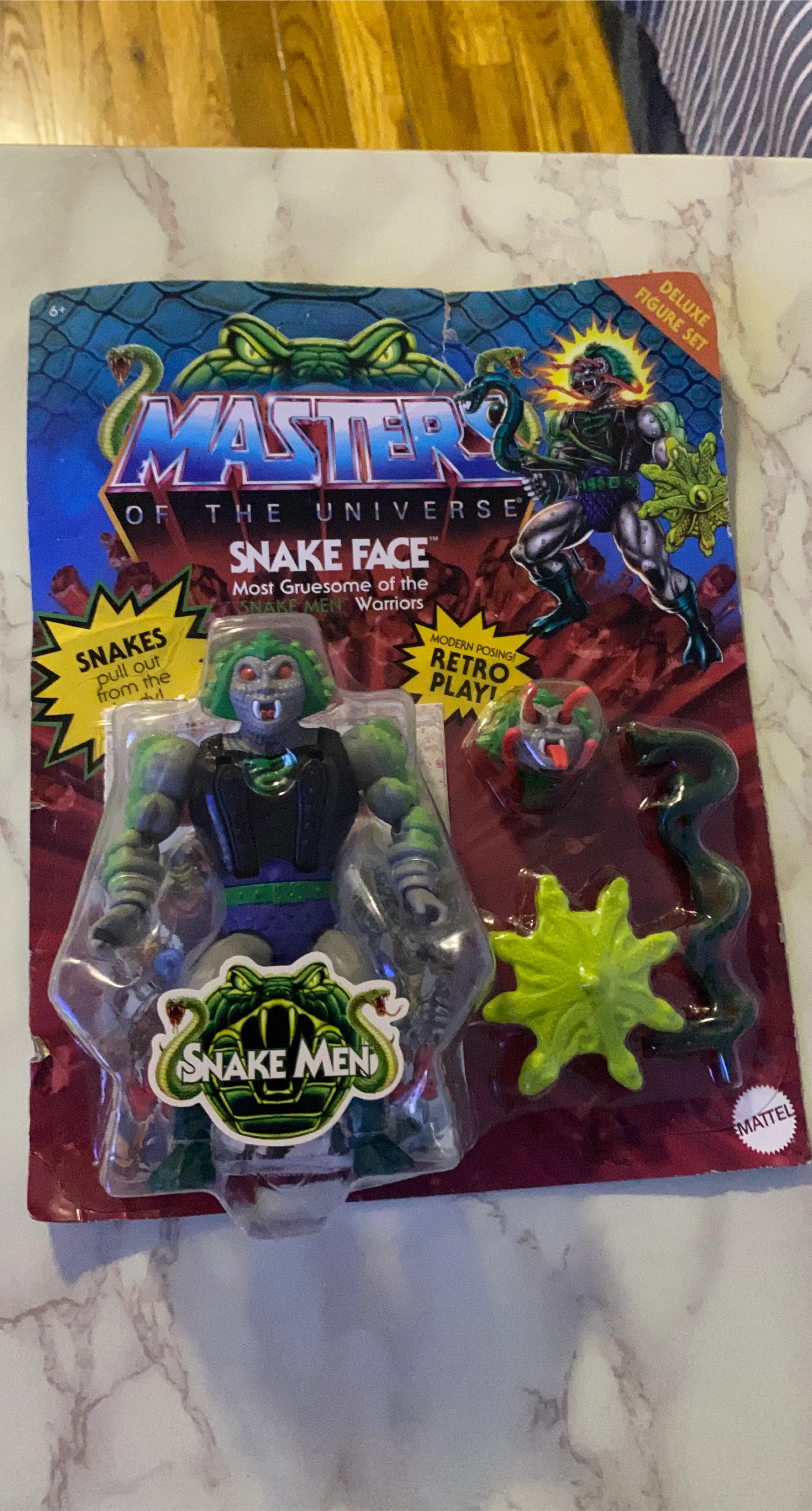 Masters of the Universe Snake Face Deluxe Figure Set. Includes figure, accessories, and retro packaging. It's part of the Snake Men Warriors collection! Modern posing with retro play!