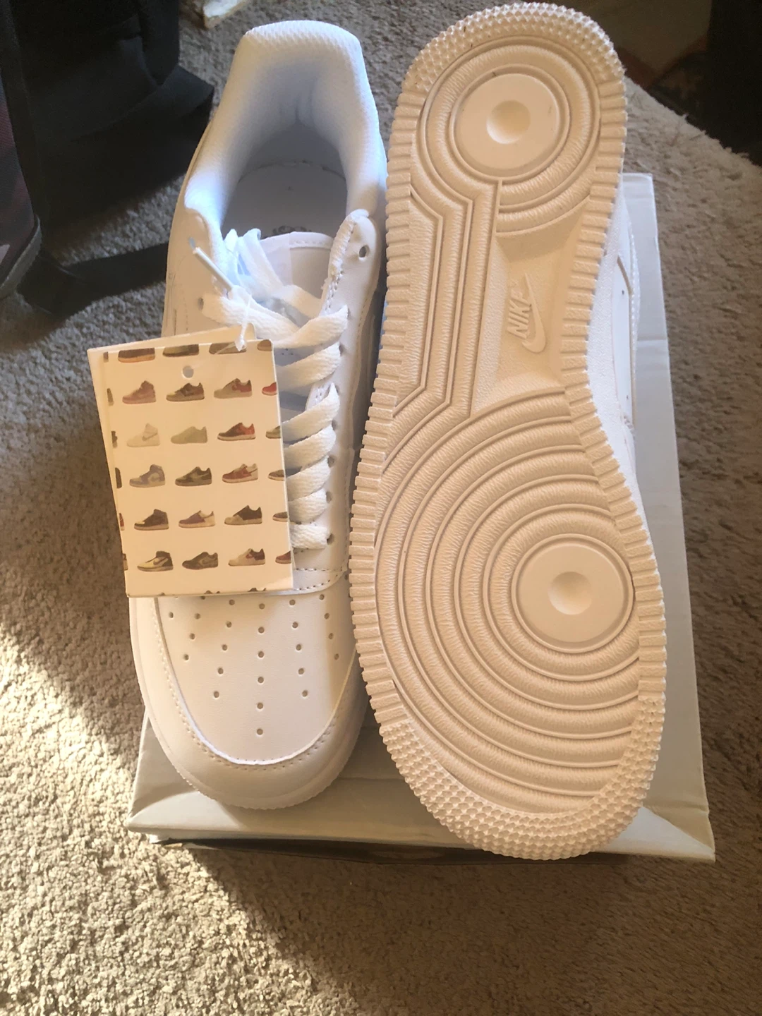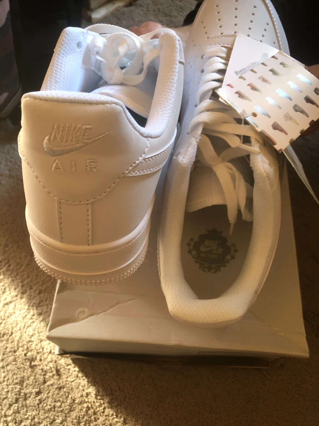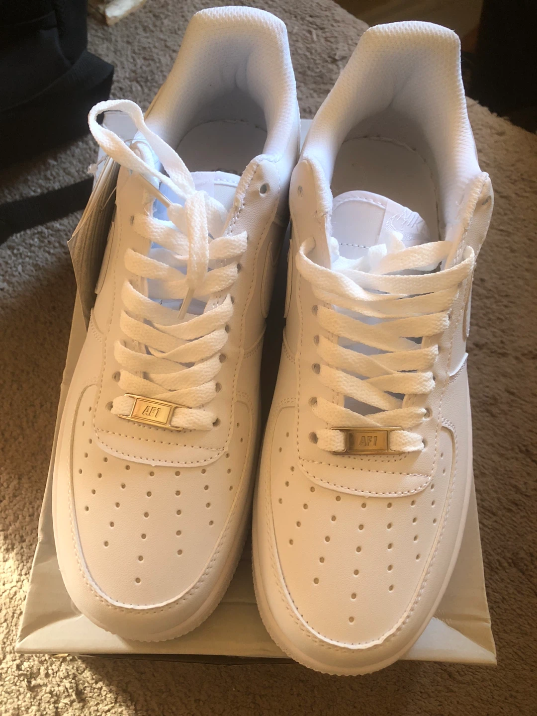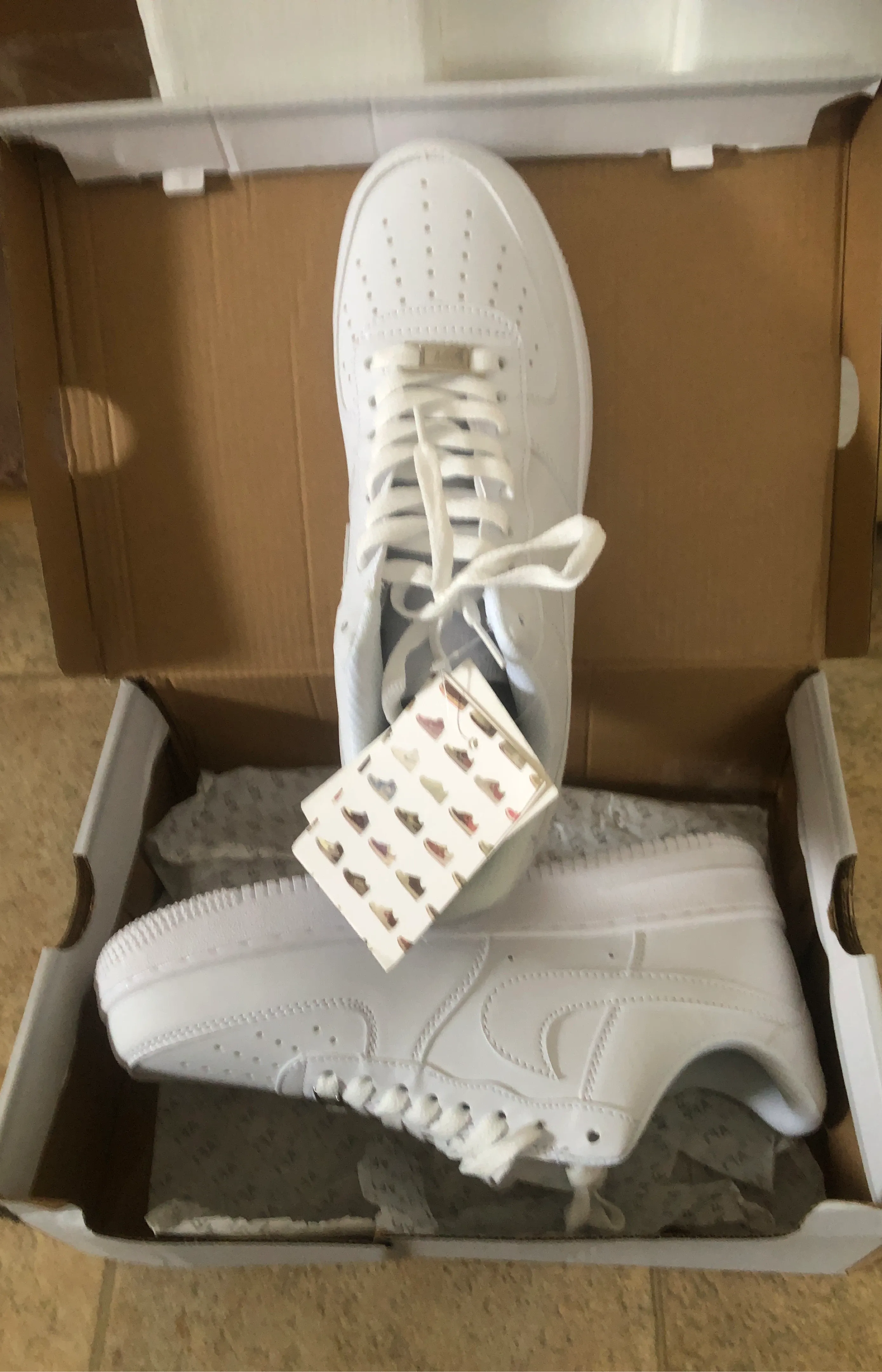Classic white Nike Air Force 1 sneakers. These kicks are made with leather and feature a rubber sole for comfort and durability. They're perfect for everyday wear and come in their original box.