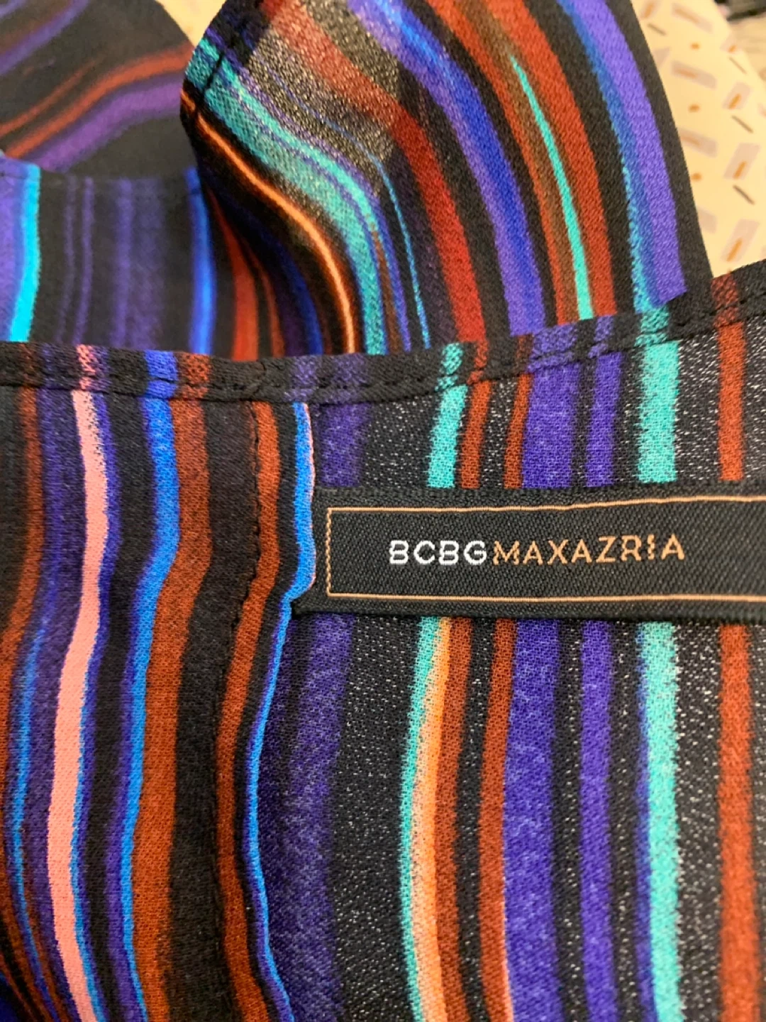 BCBGMAXAZRIA dress with a colourful striped pattern. It's a women's size medium. This dress is great for adding a pop of colour to your wardrobe!