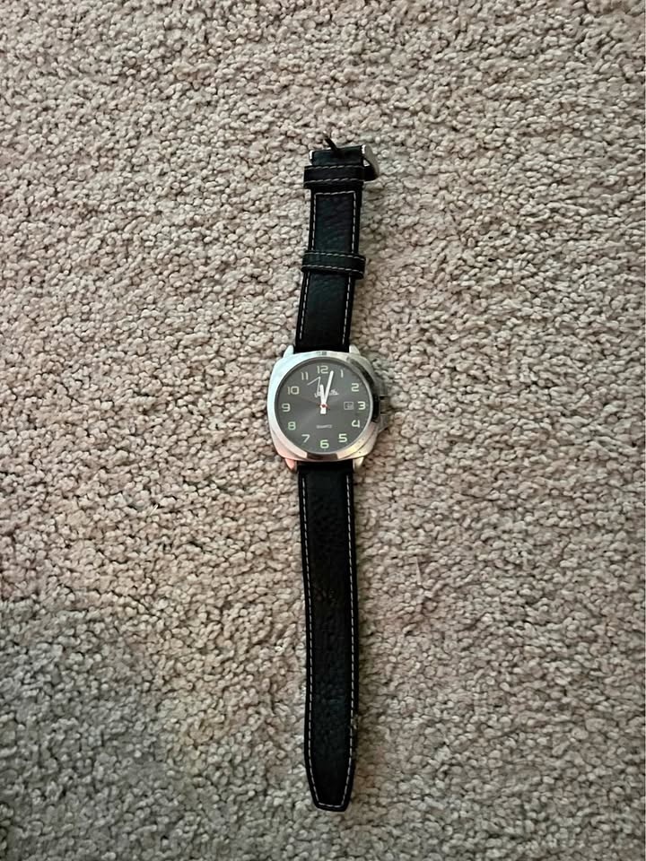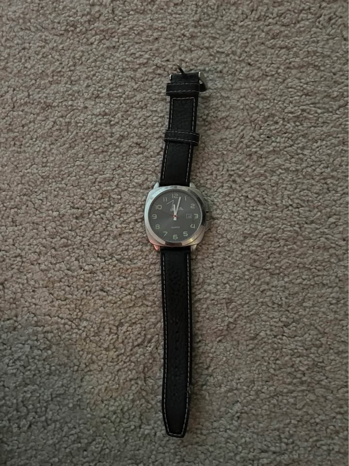 Nice silver watch with black leather strap. Has a simple analog face with green numbers. Strap is black leather with white stitching. Watch is working condition.