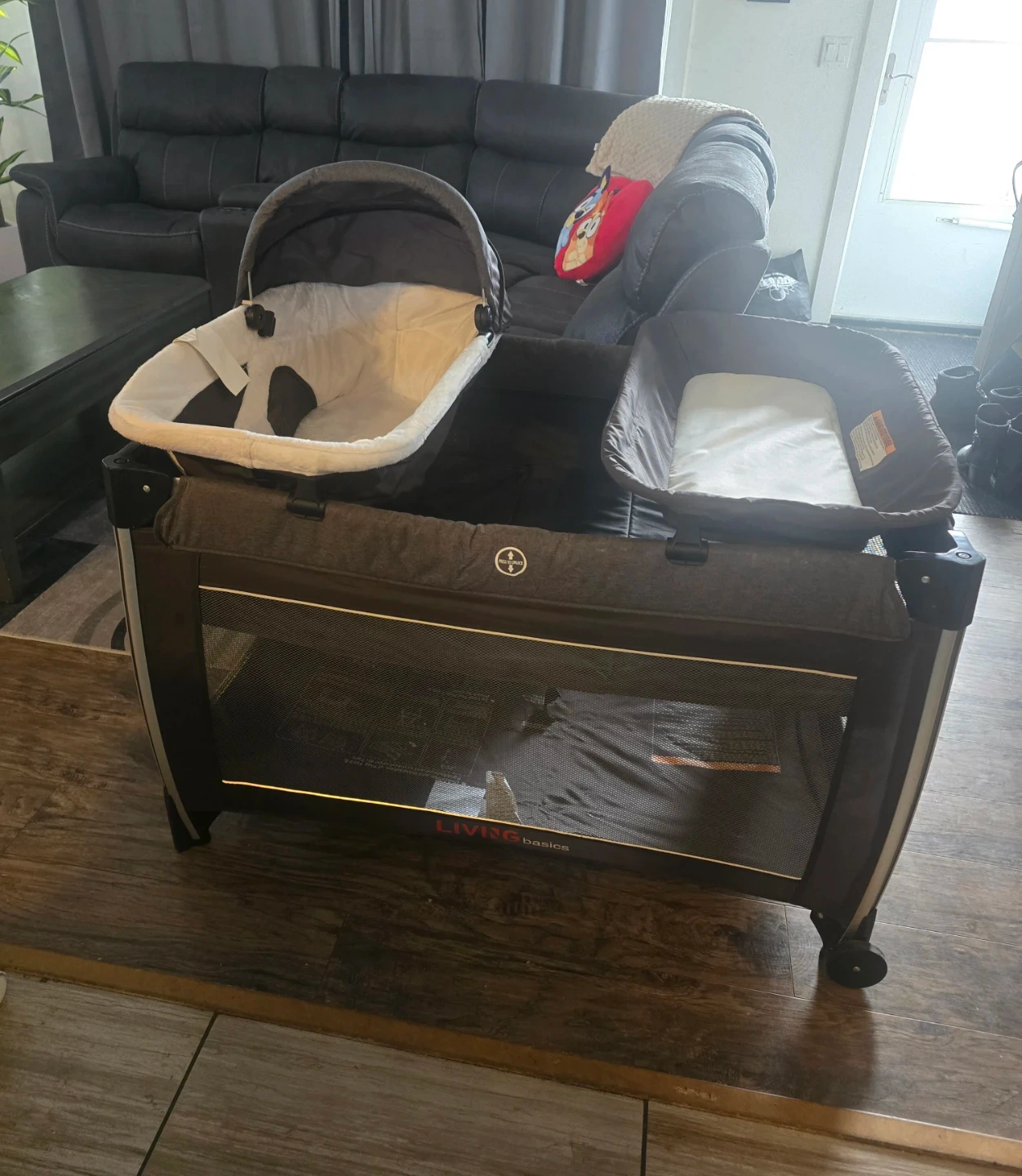 This LIVING basics 4-in-1 baby playard offers a removable bassinet and a changing table. It's foldable and designed for home travel or outdoor use. The playard includes multiple storage pockets for convenience.