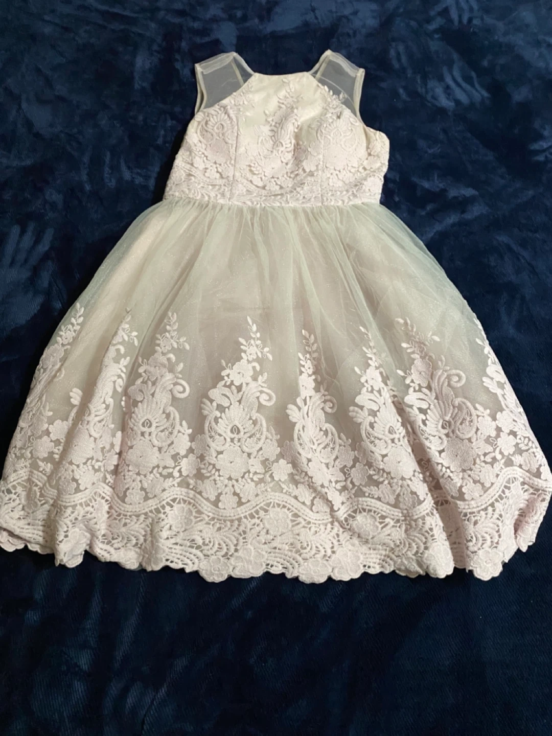 A beautiful lace dress, perfect for a special occasion! The dress features delicate floral lace detailing on the skirt and a fitted bodice. It's in great condition and ready for a new home. Mix and match with my other listings! Open to offers