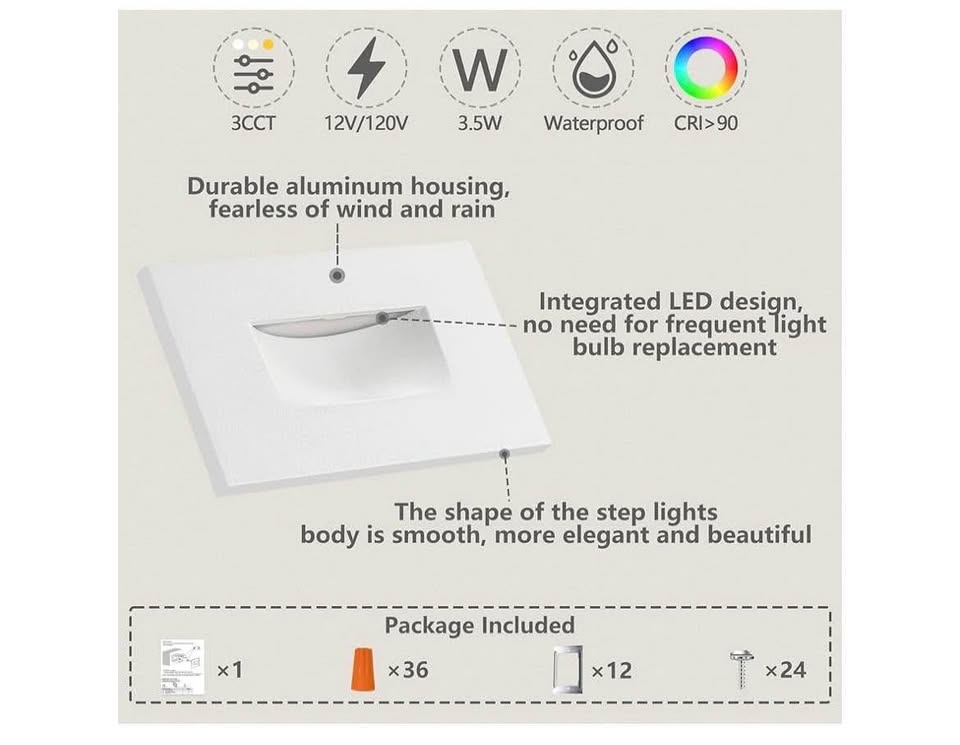 New 12-Pack Outdoor Step Lights LED Stair Lights. 12V, 3000K/4000K/5000K Color Changing. 3.5W 150LM. Low Voltage. Aluminum, Waterproof. White. $60. Pick up in Mississauga.