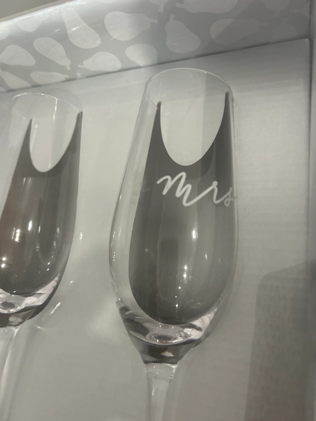 This Pearhead set includes two champagne flutes for "Mr." and "Mrs.". Made of glass. Perfect for a wedding or anniversary celebration!
