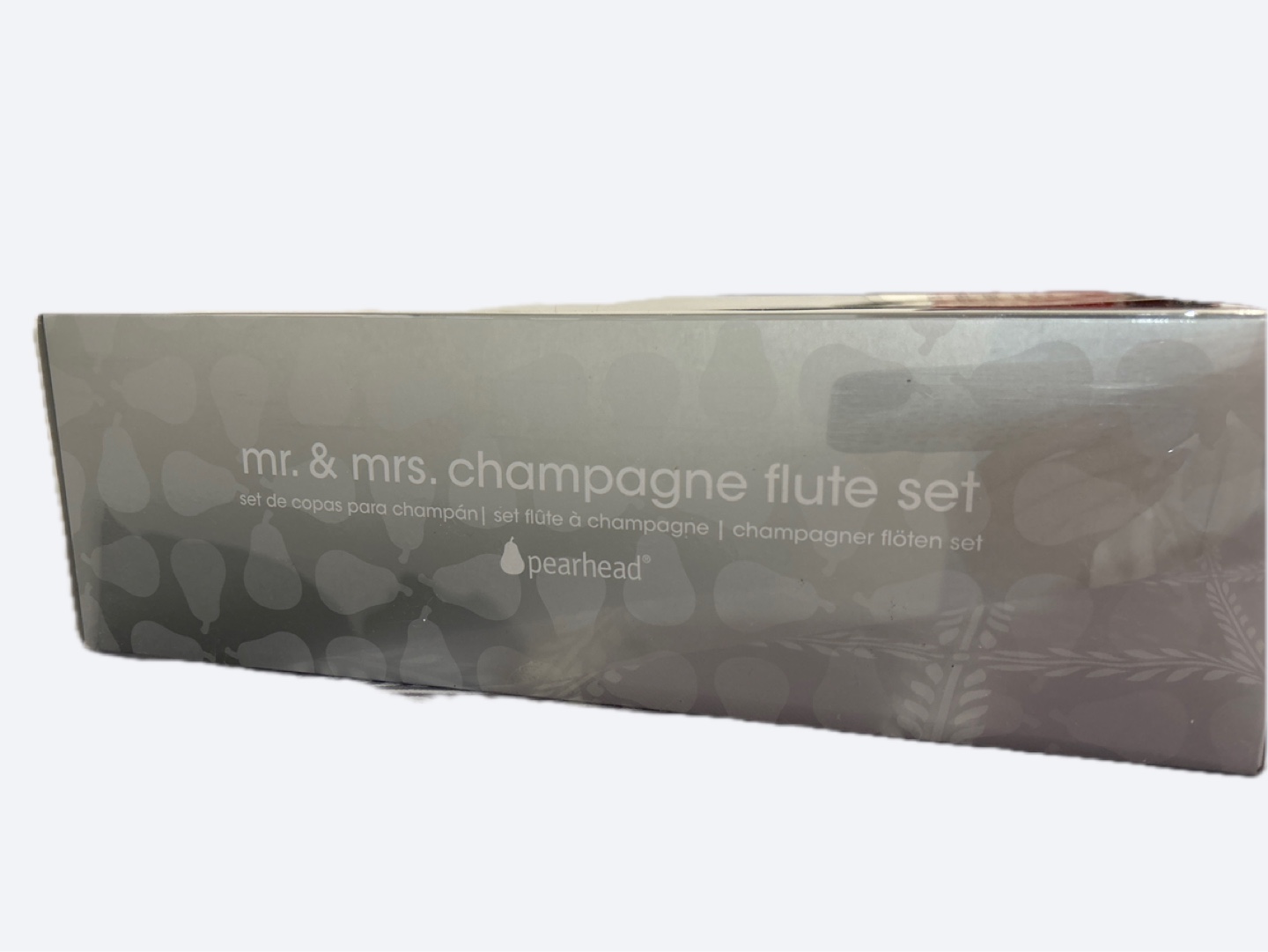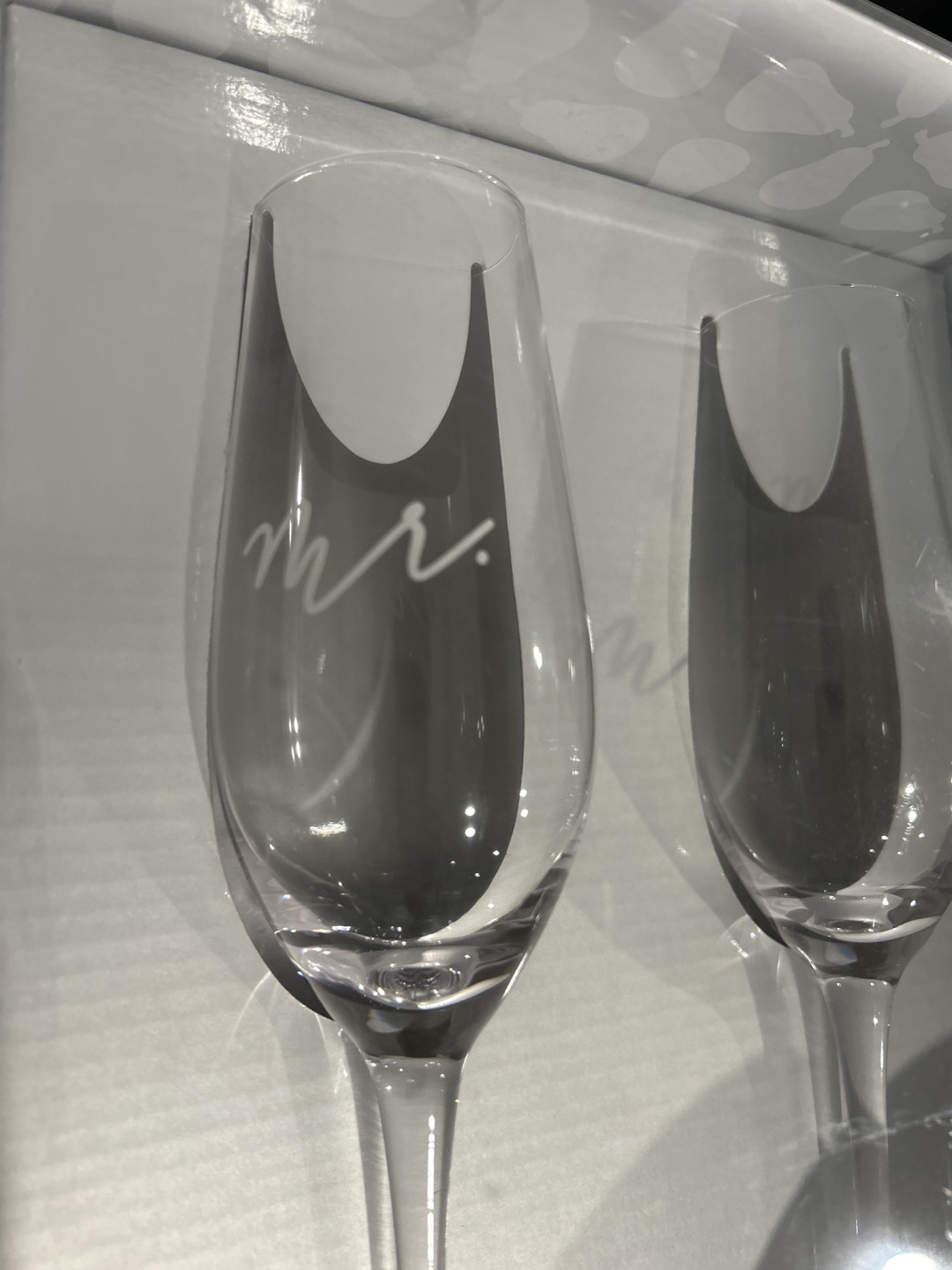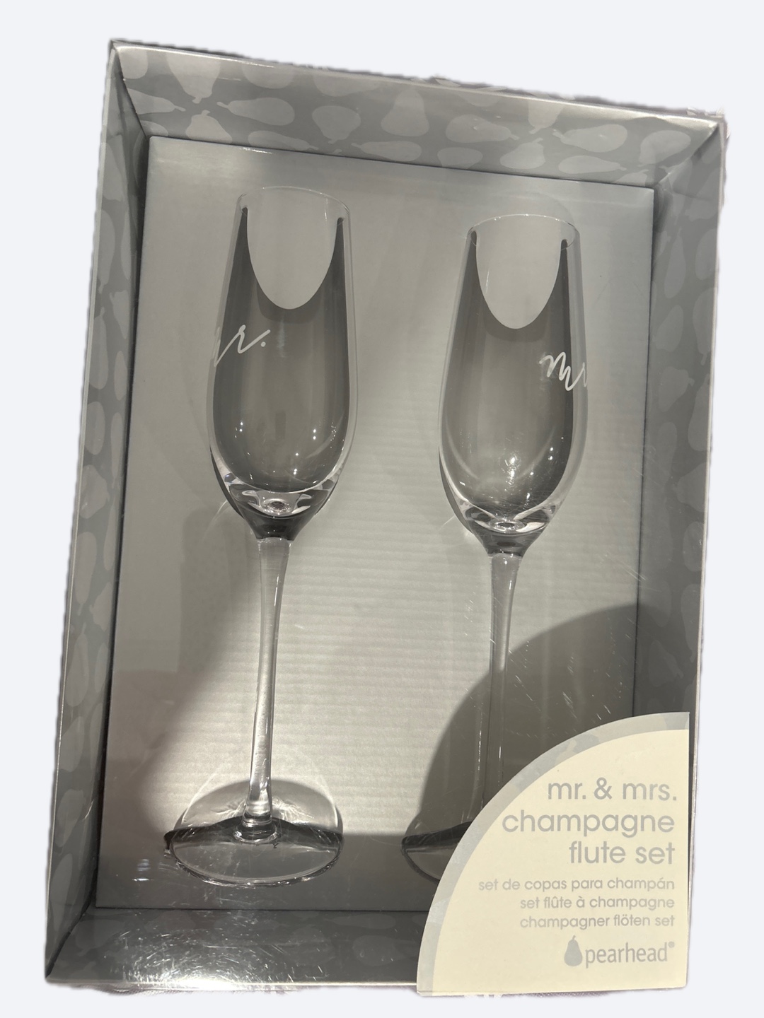 This Pearhead set includes two champagne flutes for "Mr." and "Mrs.". Made of glass. Perfect for a wedding or anniversary celebration!