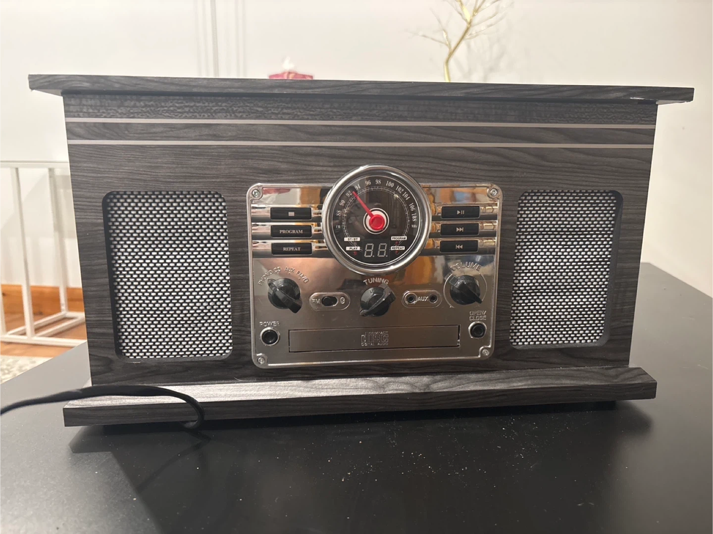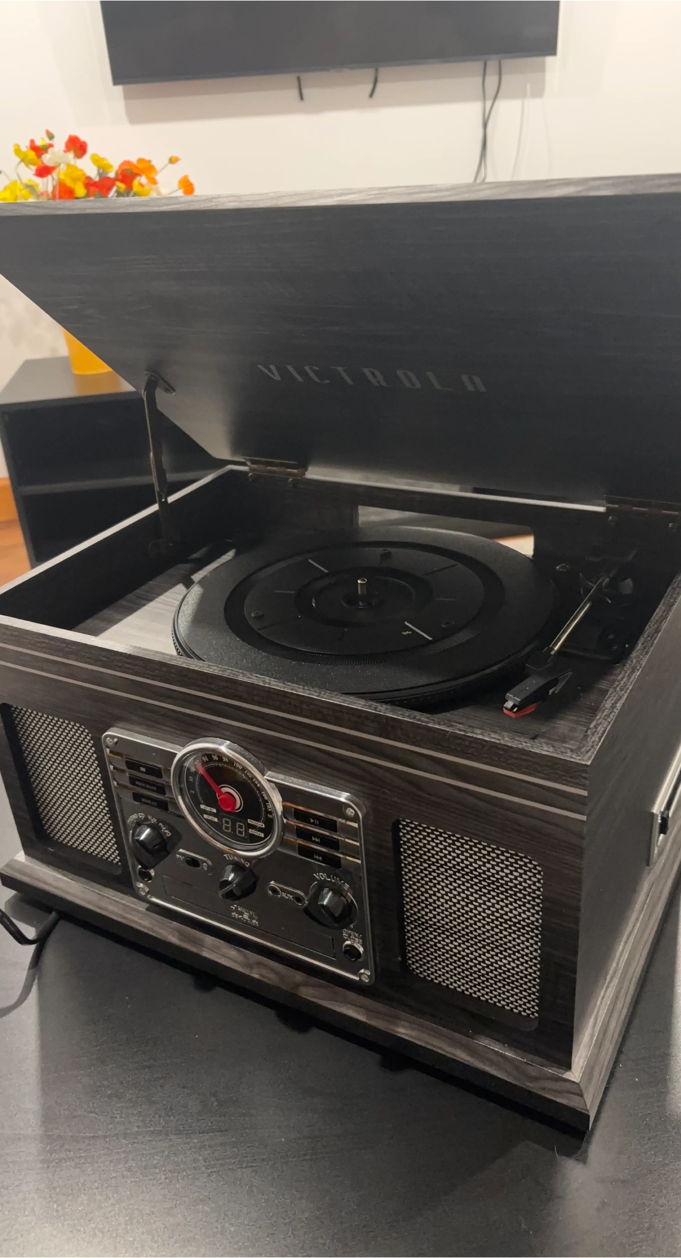 This Victrola record player features a 3-speed turntable for vinyl records. It also includes a CD player and AM/FM radio. It has auxiliary input for other devices.