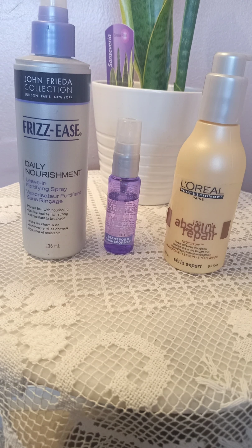 This lot includes John Frieda Frizz-Ease Daily Nourishment Leave-In Fortifying Spray (236 mL) and L'Oréal Professionnel Absolut Repair cream 150ml. It also features a Jean Freida hair serum. These products are designed for hair care.