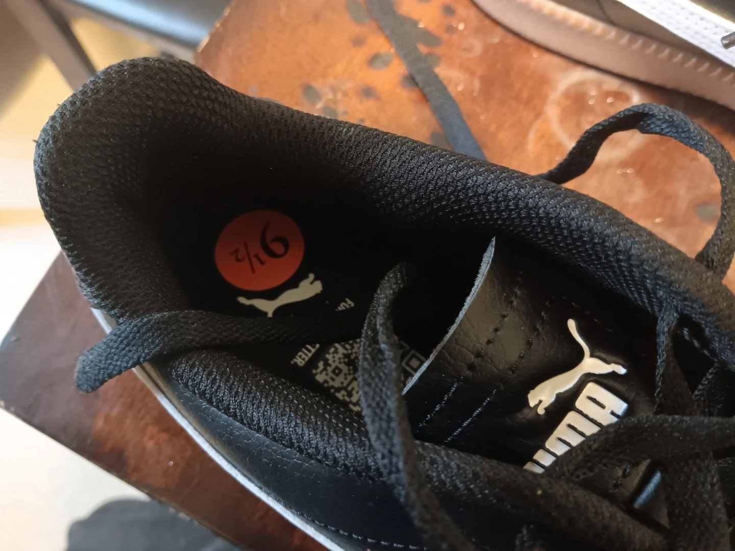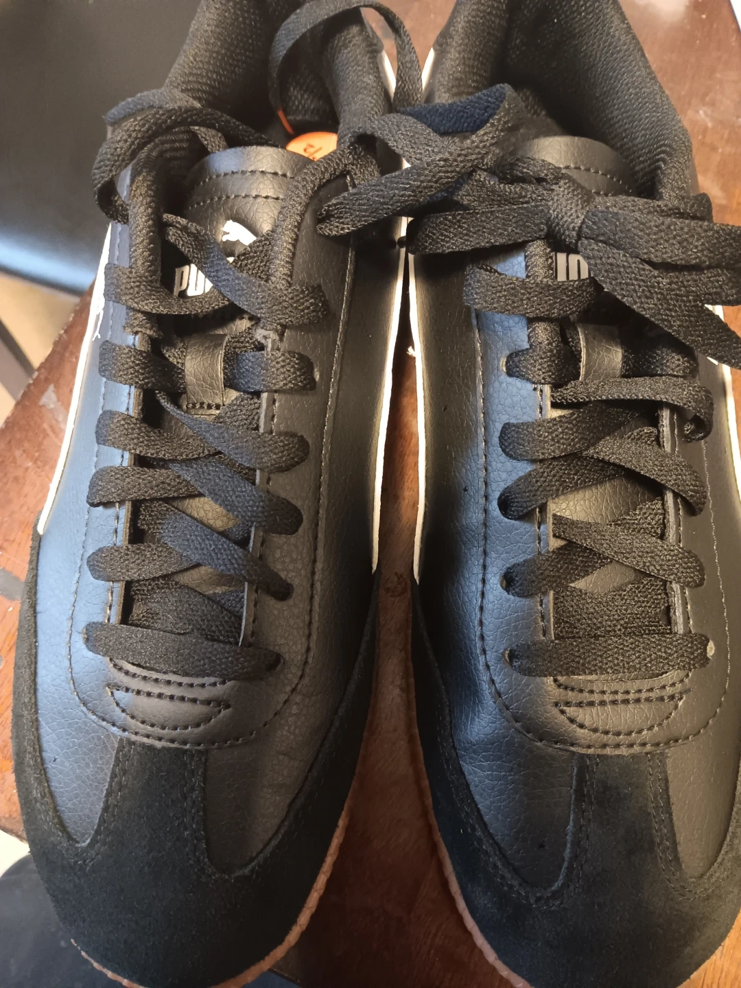 Puma black running shoes with white accents. Size is 9 1/2. These shoes are great for hitting the track or just for casual wear.