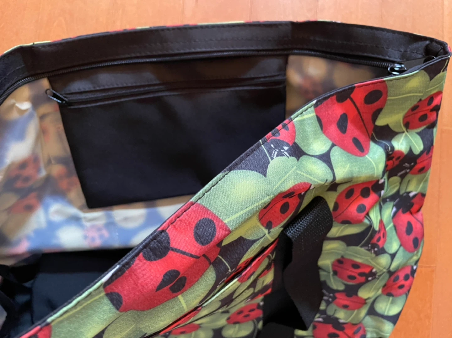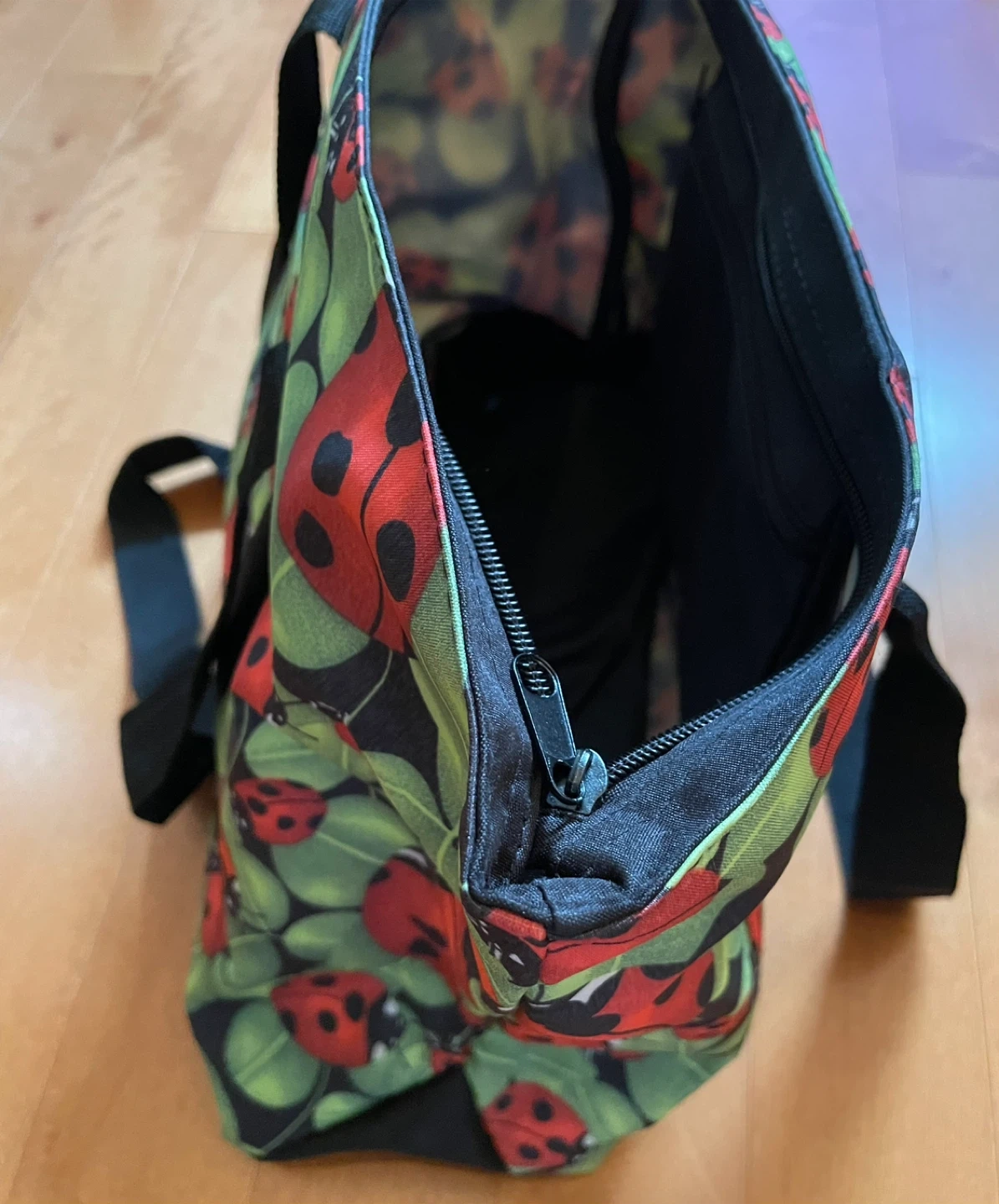 This tote bag features a cute ladybug print with a waterproof material! It has black straps and a zippered closure, 2 pockets in front plus a handy interior pocket. Also comes with a matching cosmetic pouch, support bottom of the bag, perfect for keeping your essentials organized