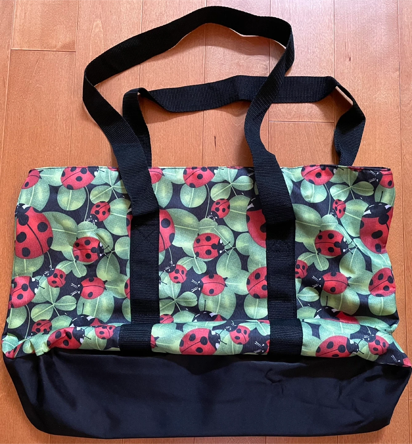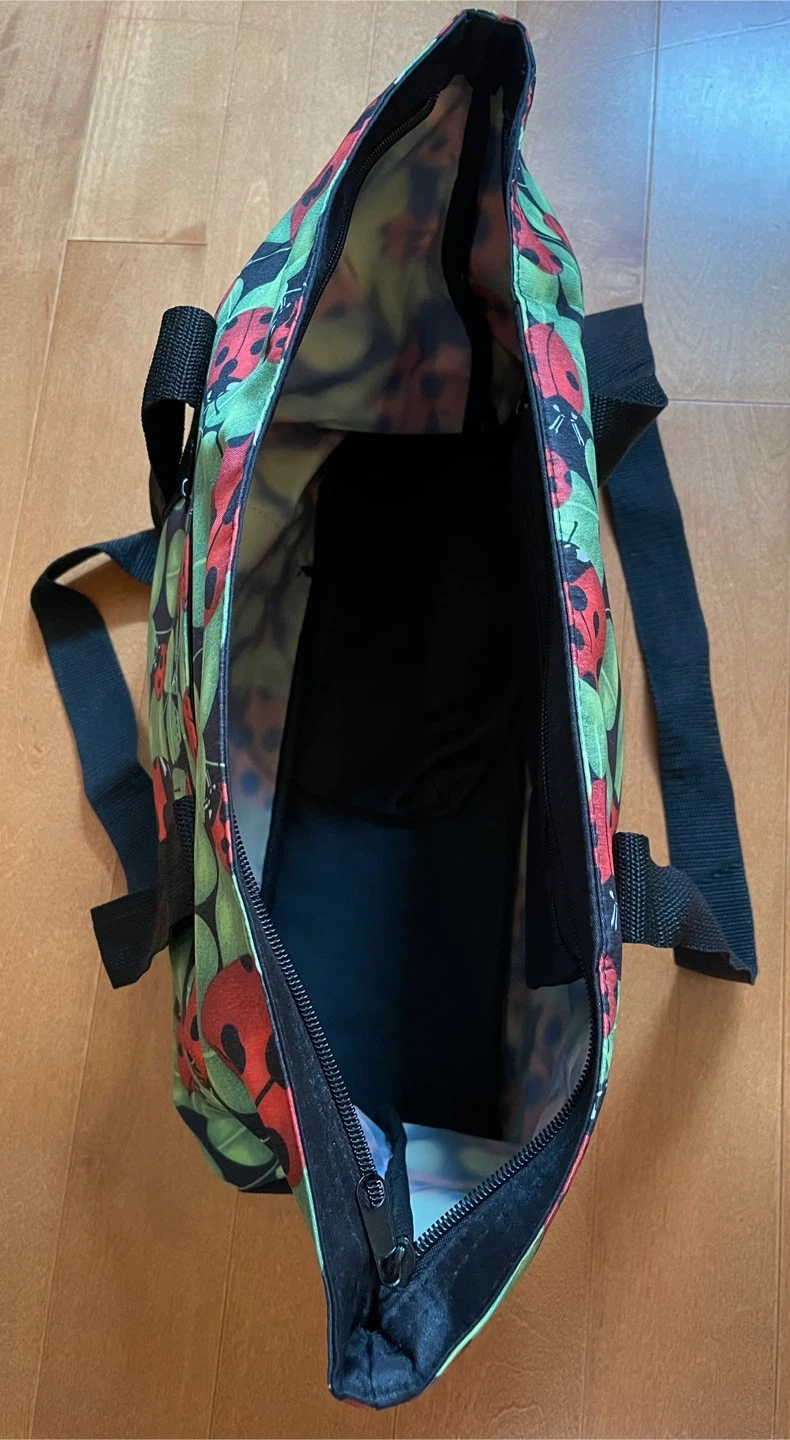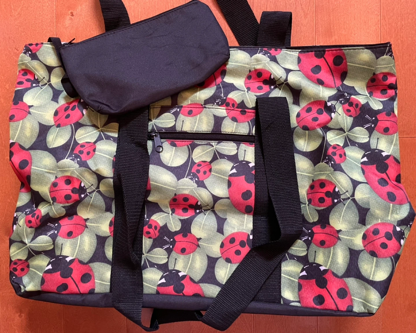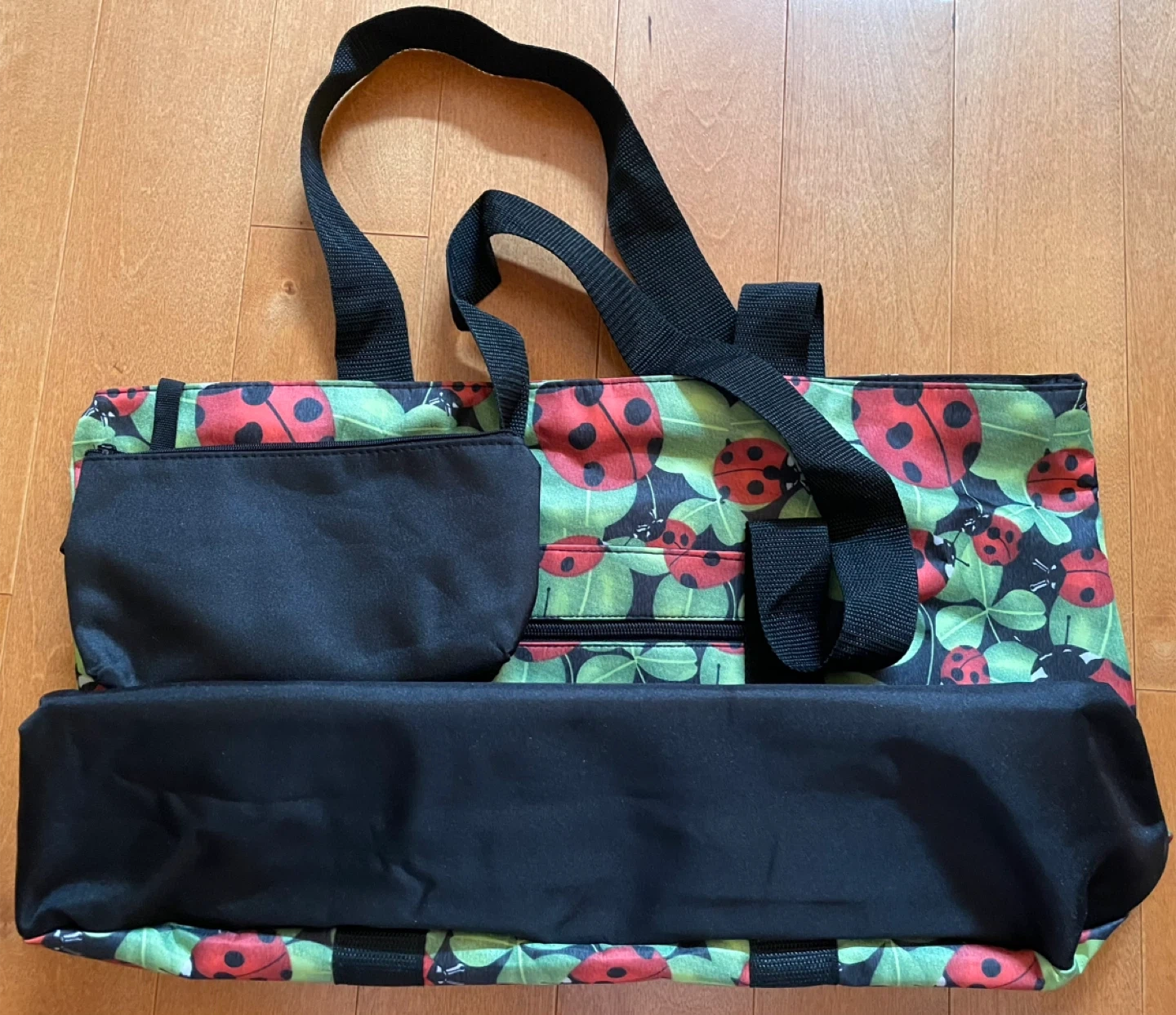 This tote bag features a cute ladybug print with a waterproof material! It has black straps and a zippered closure, 2 pockets in front plus a handy interior pocket. Also comes with a matching cosmetic pouch, support bottom of the bag, perfect for keeping your essentials organized