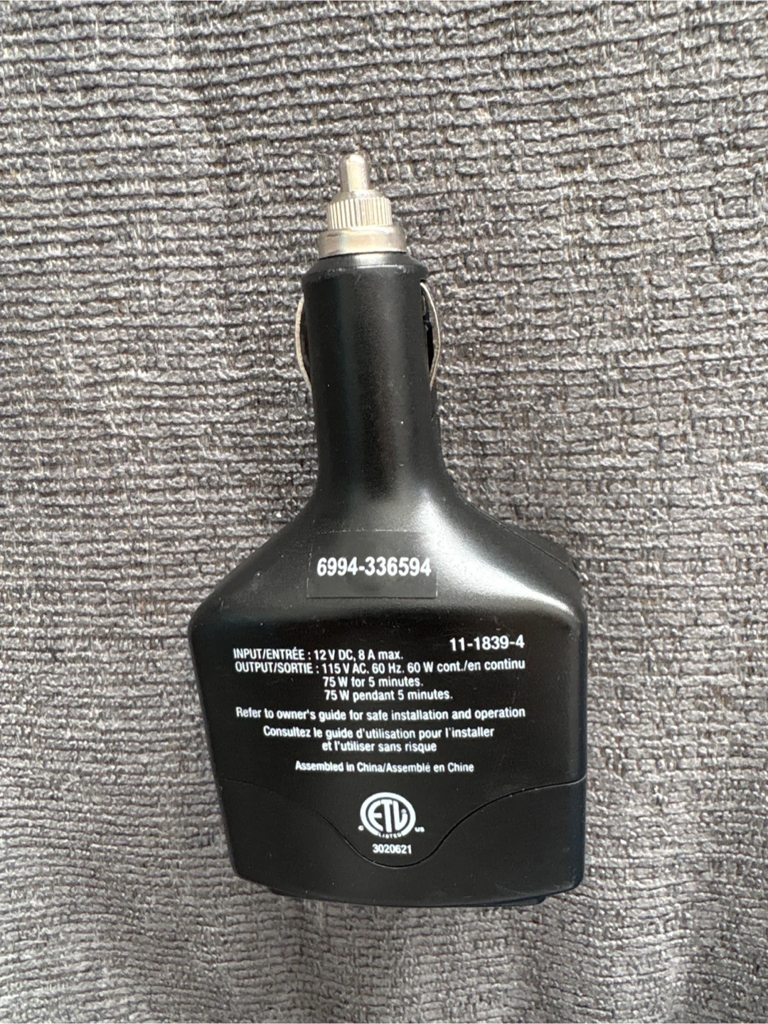 This is a Motomaster Eliminator 75W mobile power inverter. It has an input of 12V DC, 8A max and an output of 115V AC, 60 Hz, 60W cont./en continu, 75W peak.