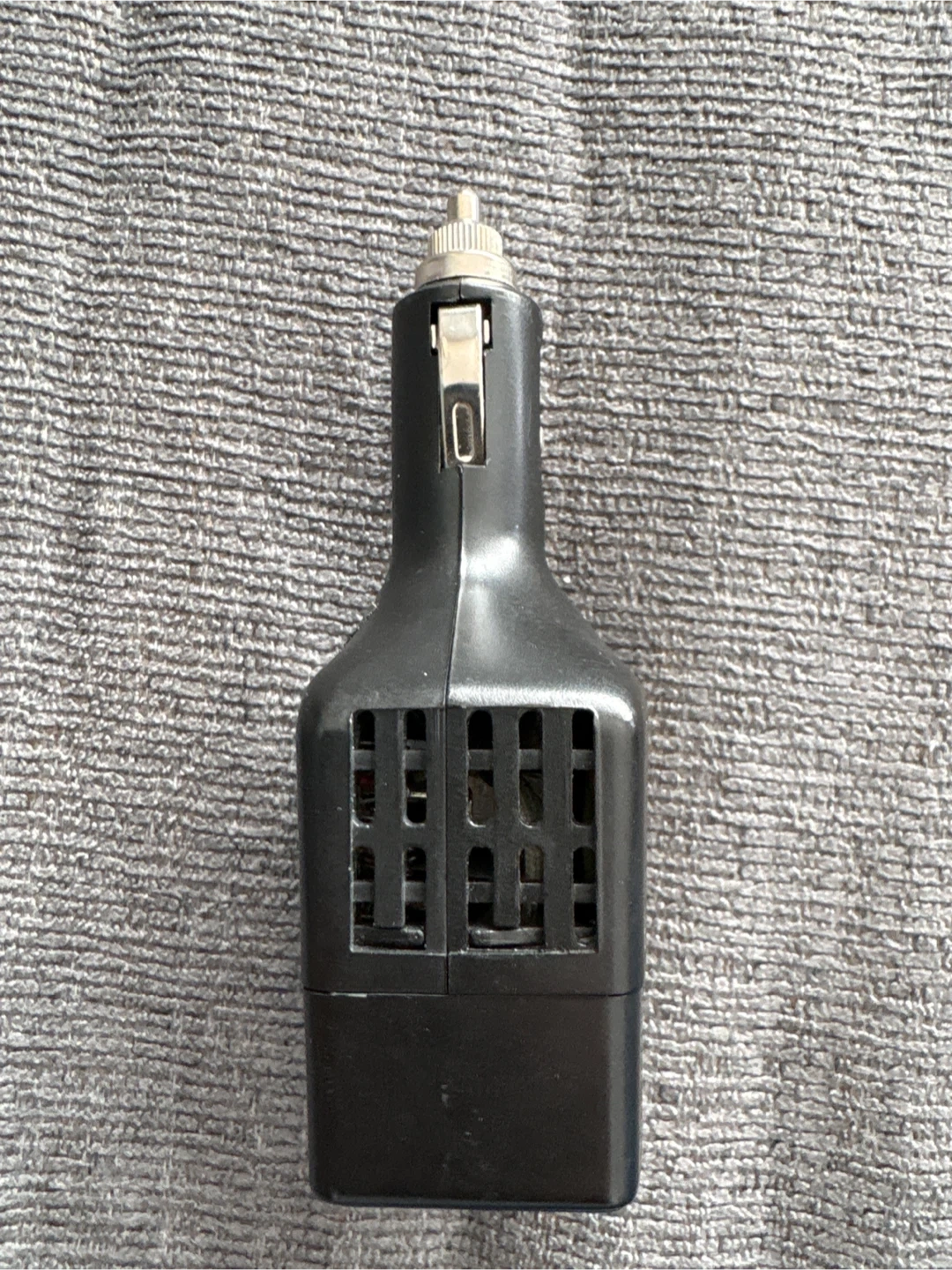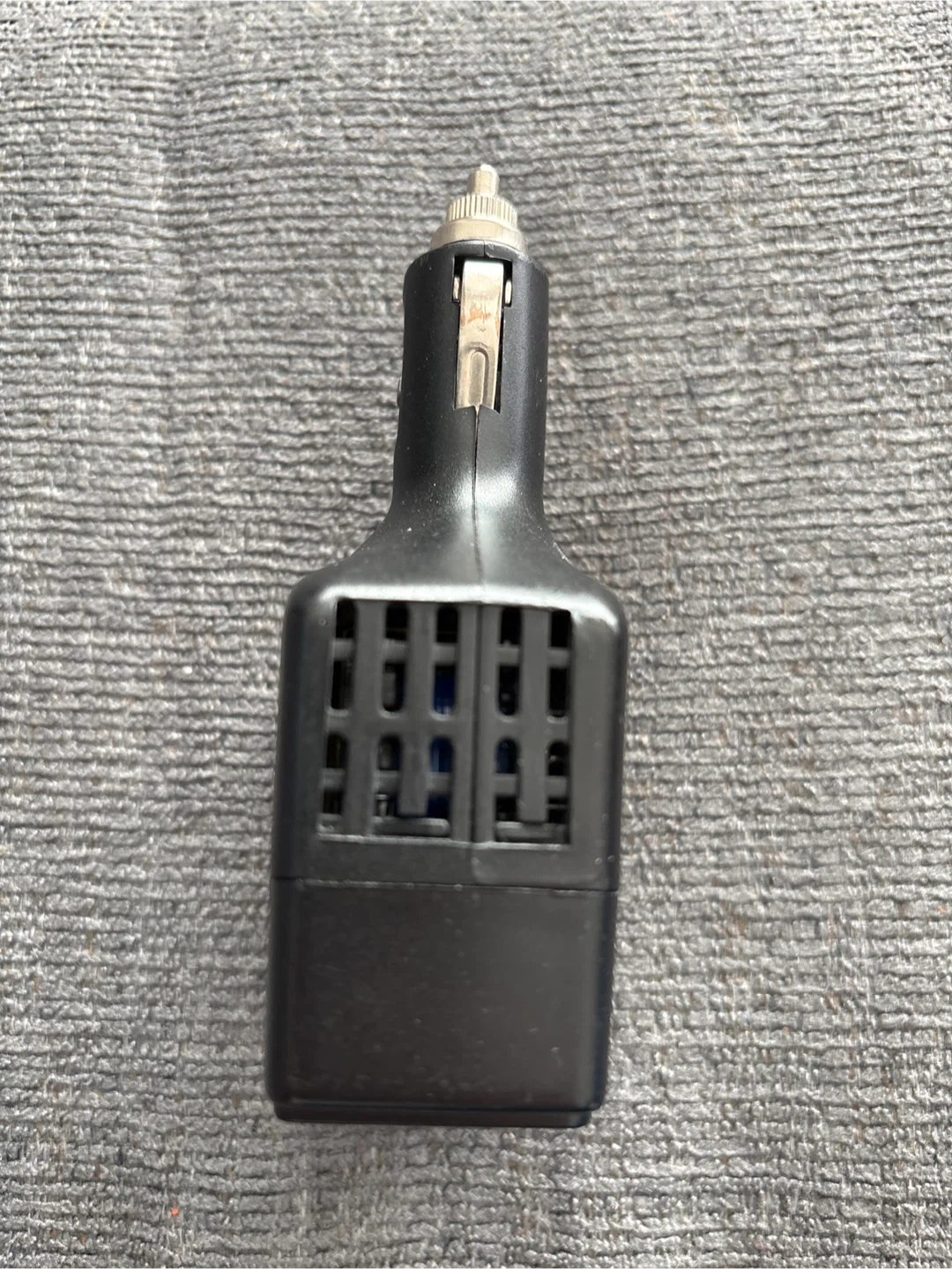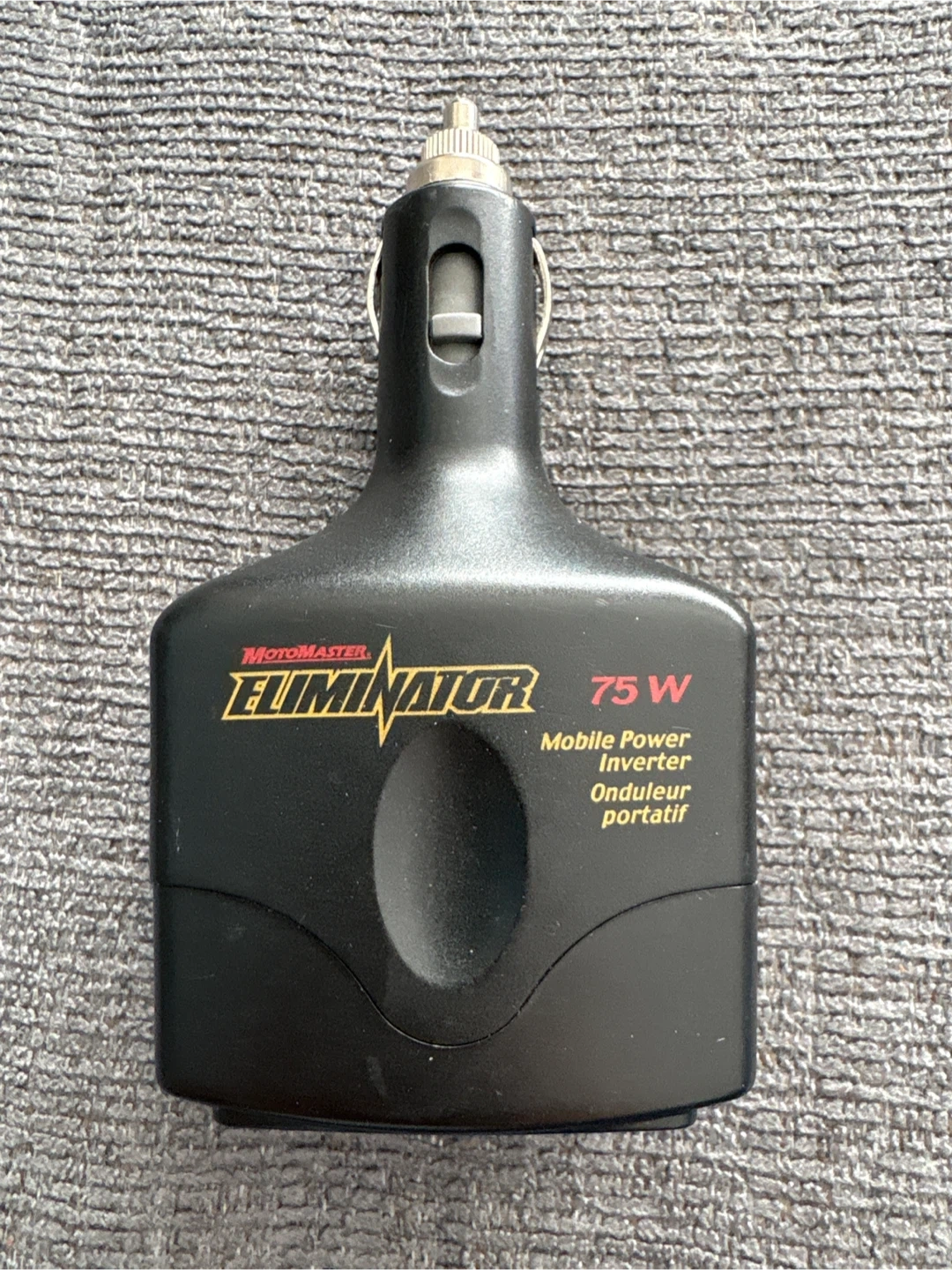 This is a Motomaster Eliminator 75W mobile power inverter. It has an input of 12V DC, 8A max and an output of 115V AC, 60 Hz, 60W cont./en continu, 75W peak.