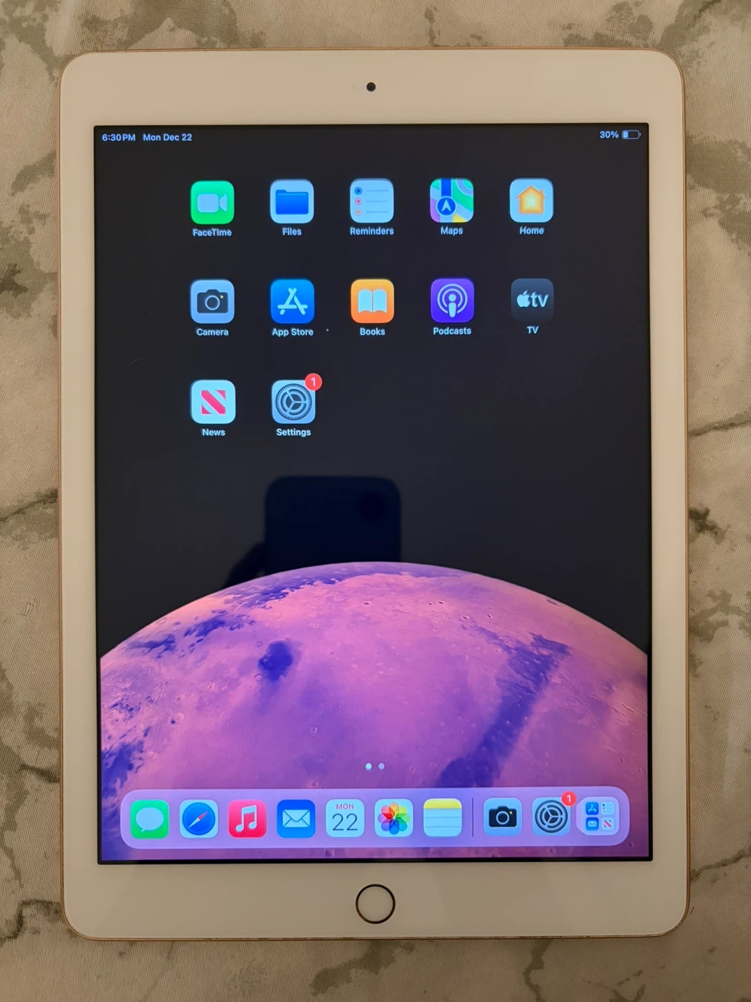 This is a gold Apple iPad (6th generation) with 128GB of storage. It runs iPadOS 17.5.1. This device is great for browsing, streaming, and casual gaming. It's in good condition and ready for a new owner!