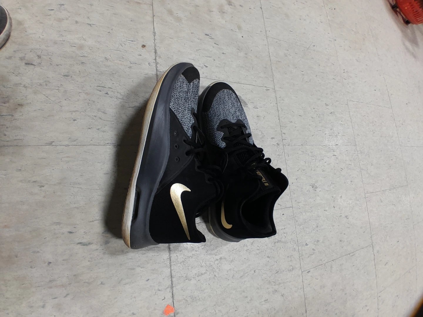 Black and grey Nike basketball shoes. Features a gold swoosh accent and a durable rubber sole. Great for on the court! Men's size 11.5