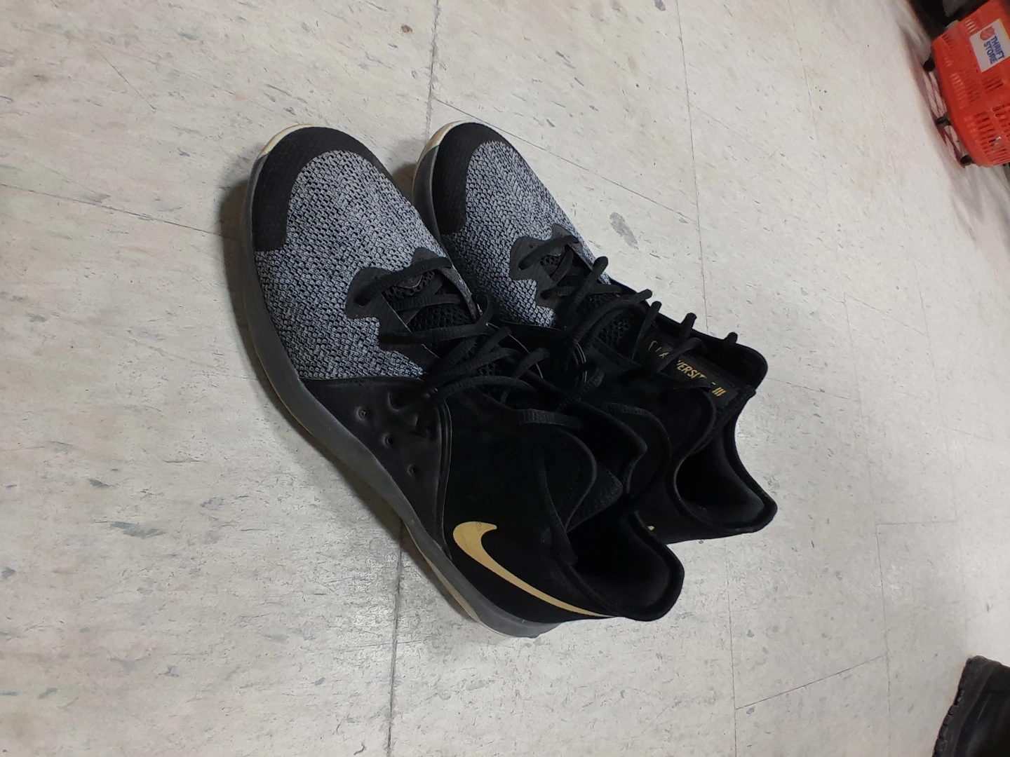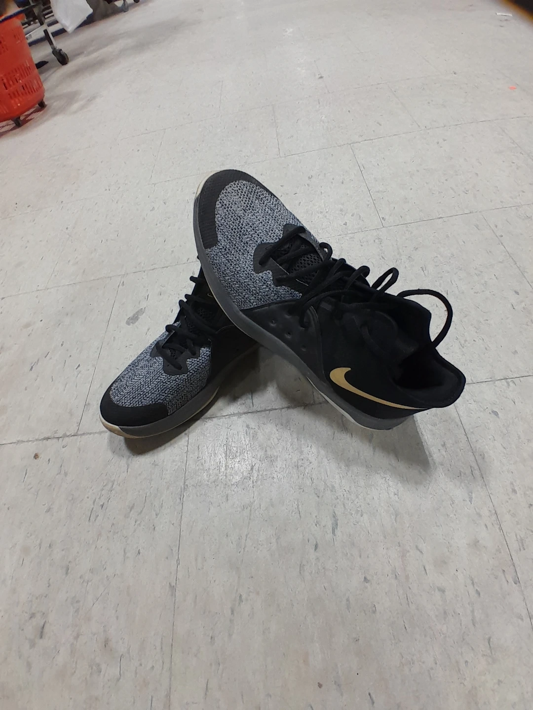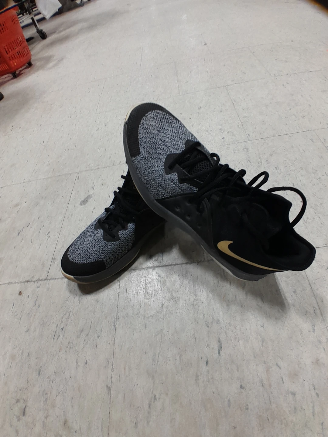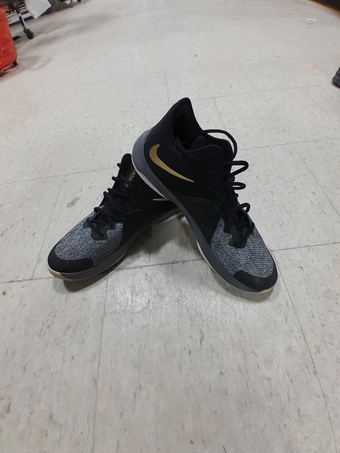 Black and grey Nike basketball shoes. Features a gold swoosh accent and a durable rubber sole. Great for on the court! Men's size 11.5