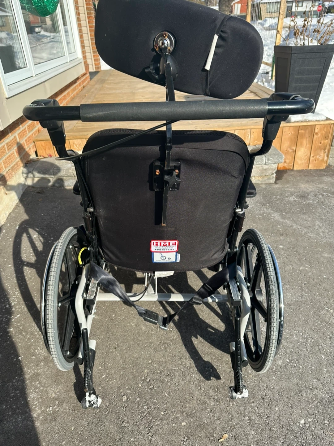 This Sunrise Medical "Supertilt" wheelchair is designed for comfort and support. It's a 20x18 size. The wheelchair includes a headrest and adjustable armrests for customized positioning. It's a versatile mobility aid for various needs. Air cushion seat with pump for comfort.