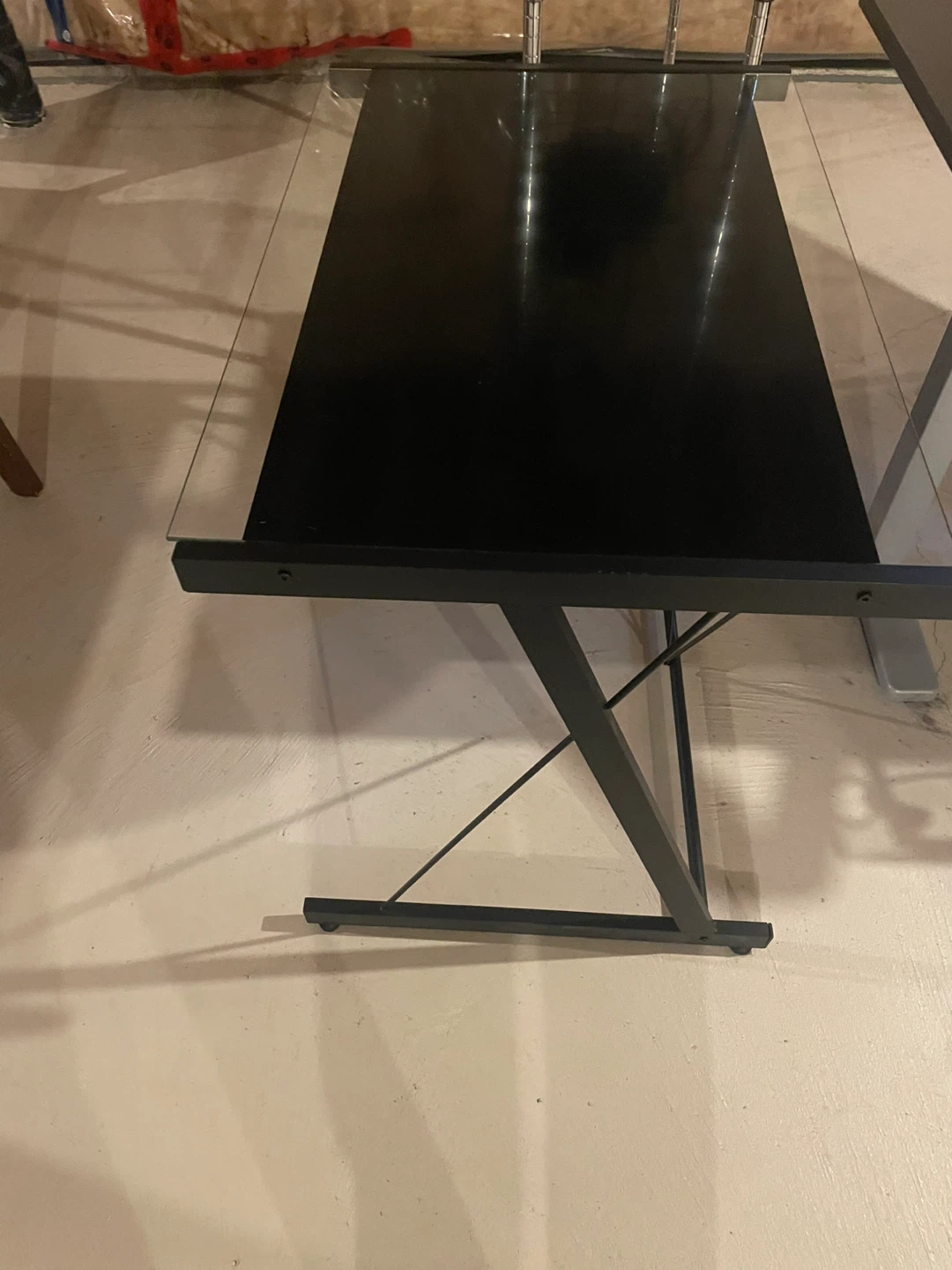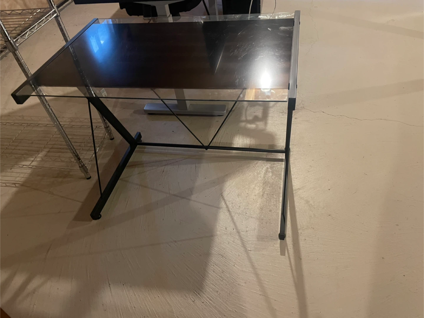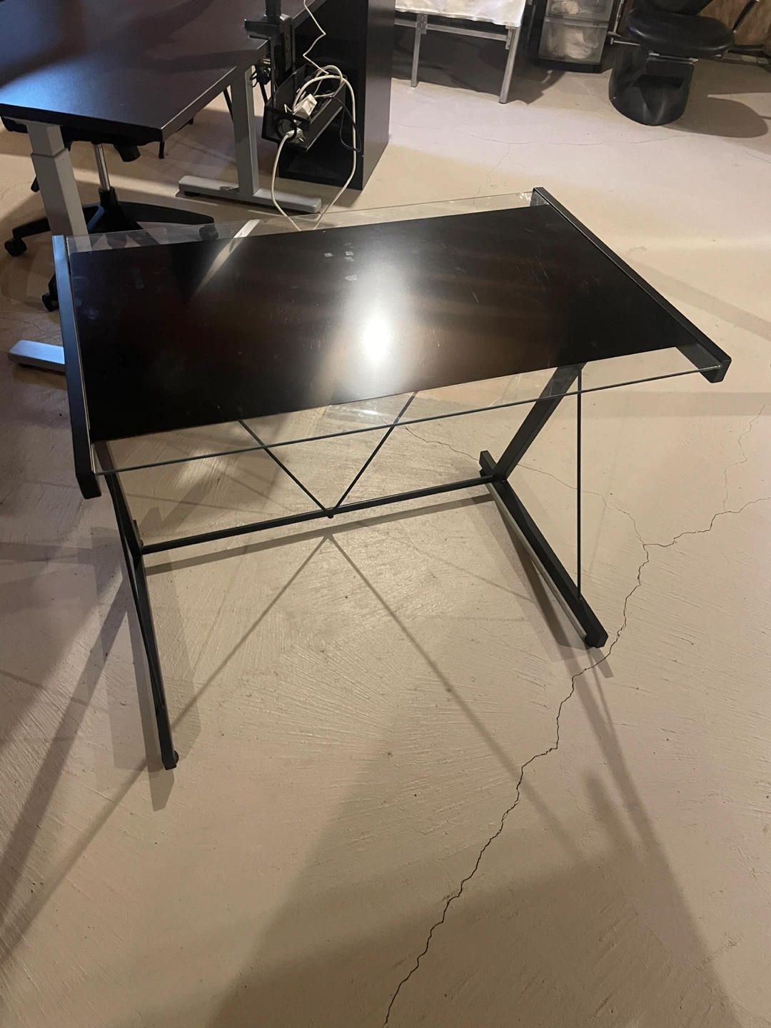 This desk features a sleek black glass top with a metal frame. It's a modern and functional addition to any workspace. Dimensions are approximately 47 inches wide by 24 inches deep.