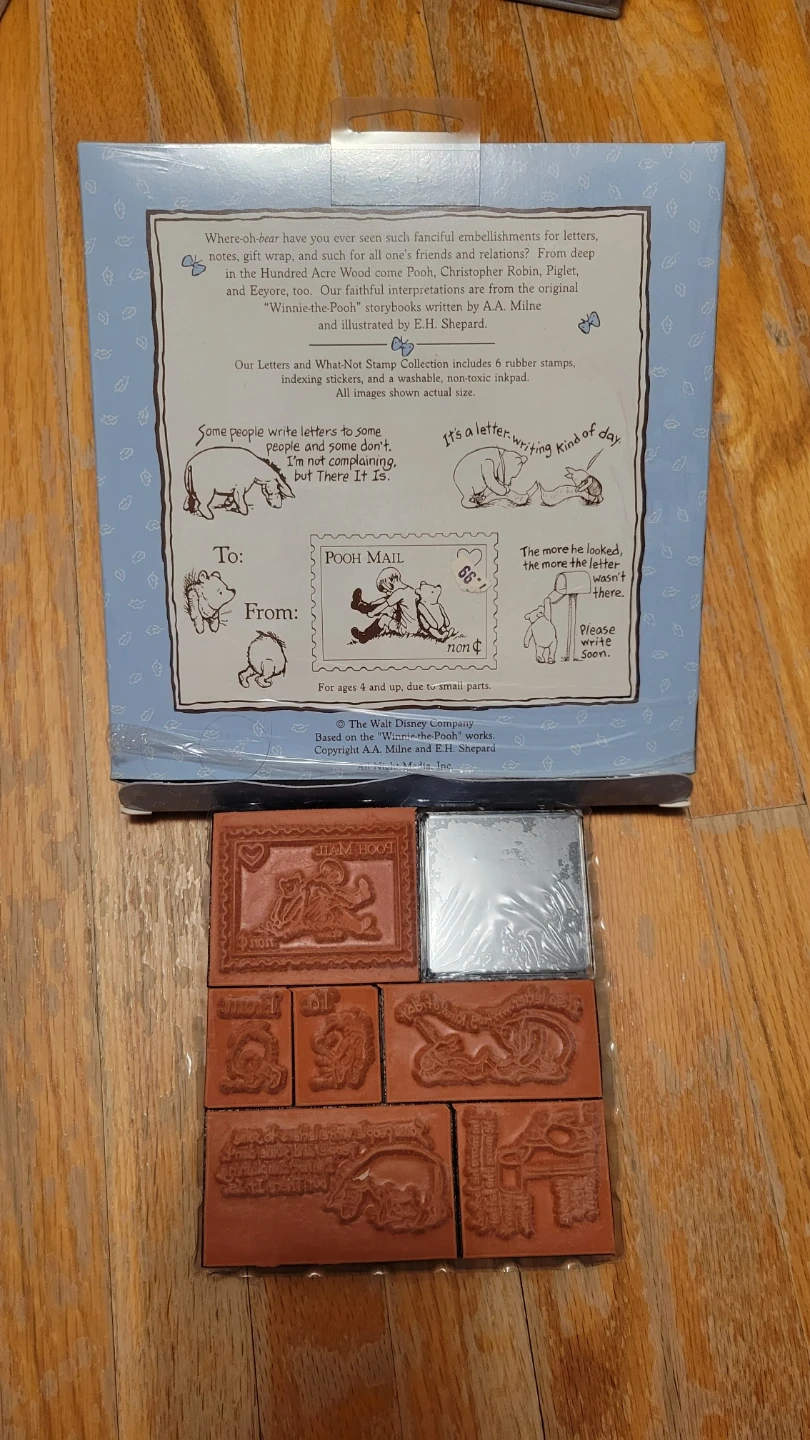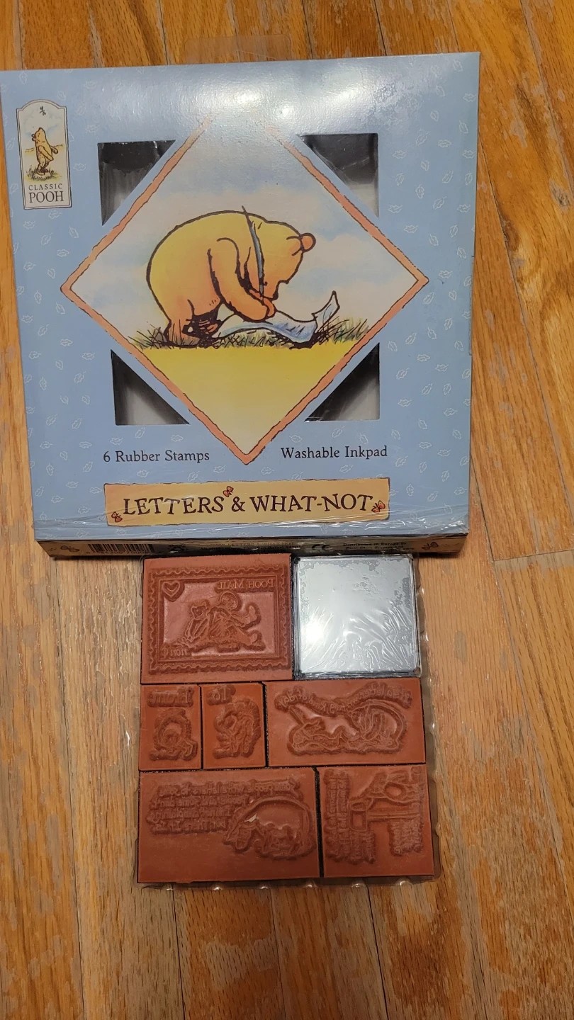 This is a Letters & What-Not Stamp Collection featuring 6 rubber stamps. It includes a washable, non-toxic inkpad. Stamps are inspired by A.A. Milne's "Winnie-the-Pooh" stories and E.H. Shepard's illustrations. Perfect for crafting or creative mail projects!
