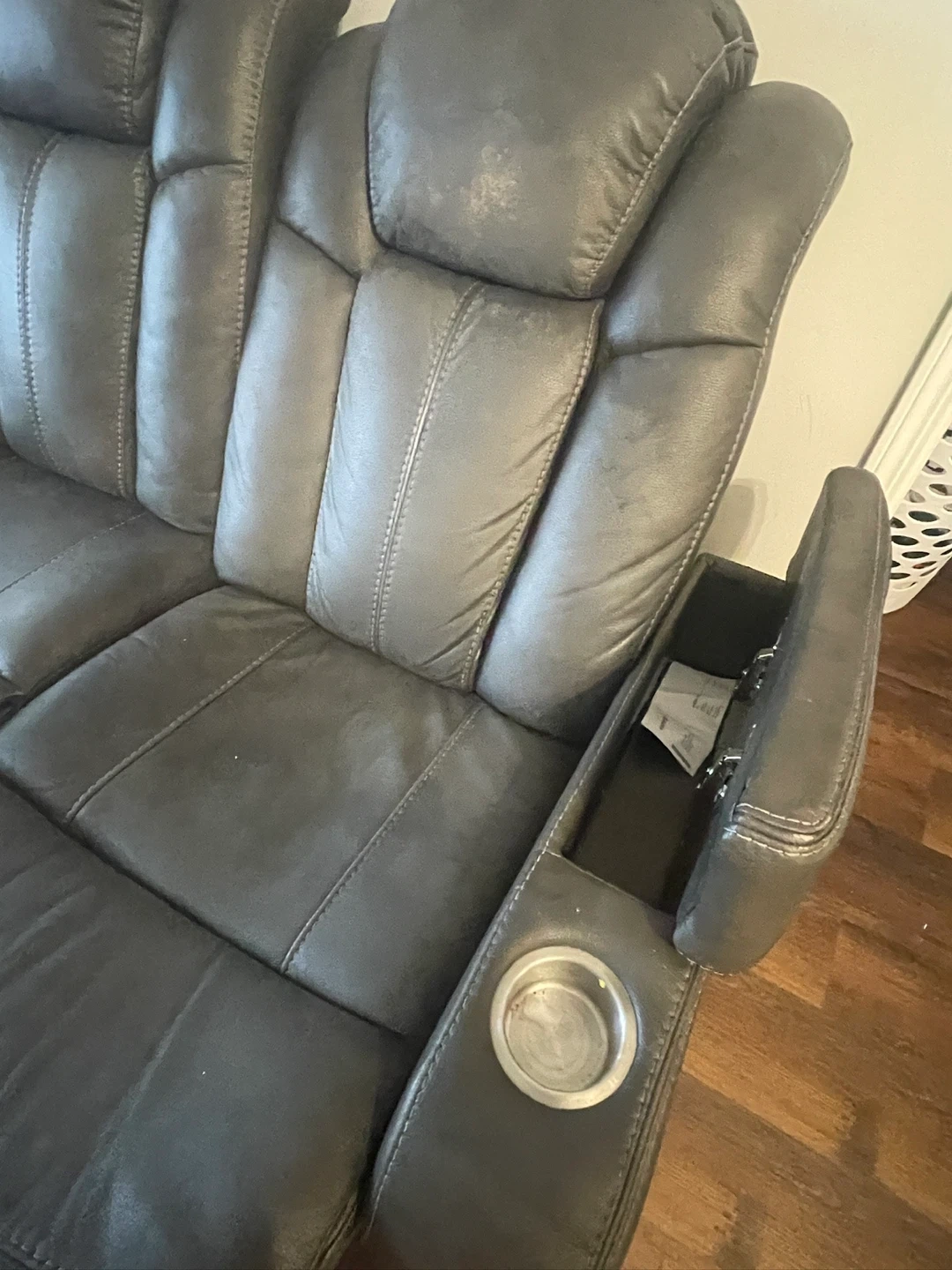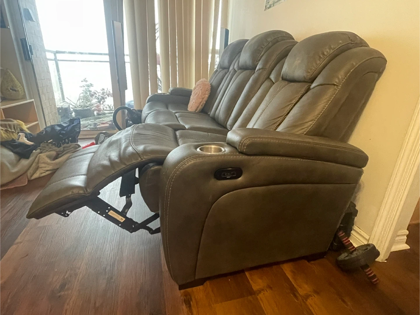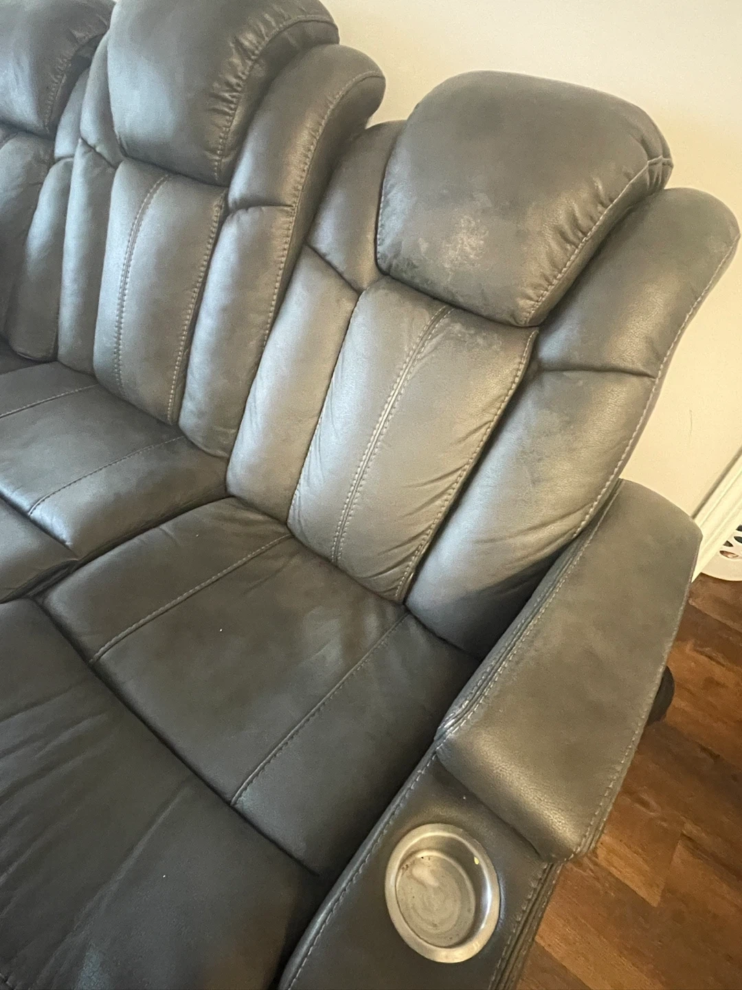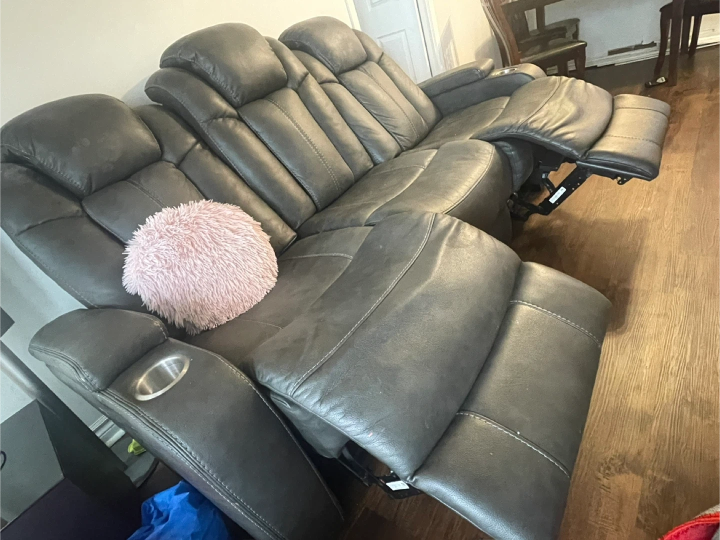 Selling a comfy three-seat reclining sofa! It's in a grey colour and features built-in cupholders on each end. Perfect for movie nights or just relaxing after a long day!