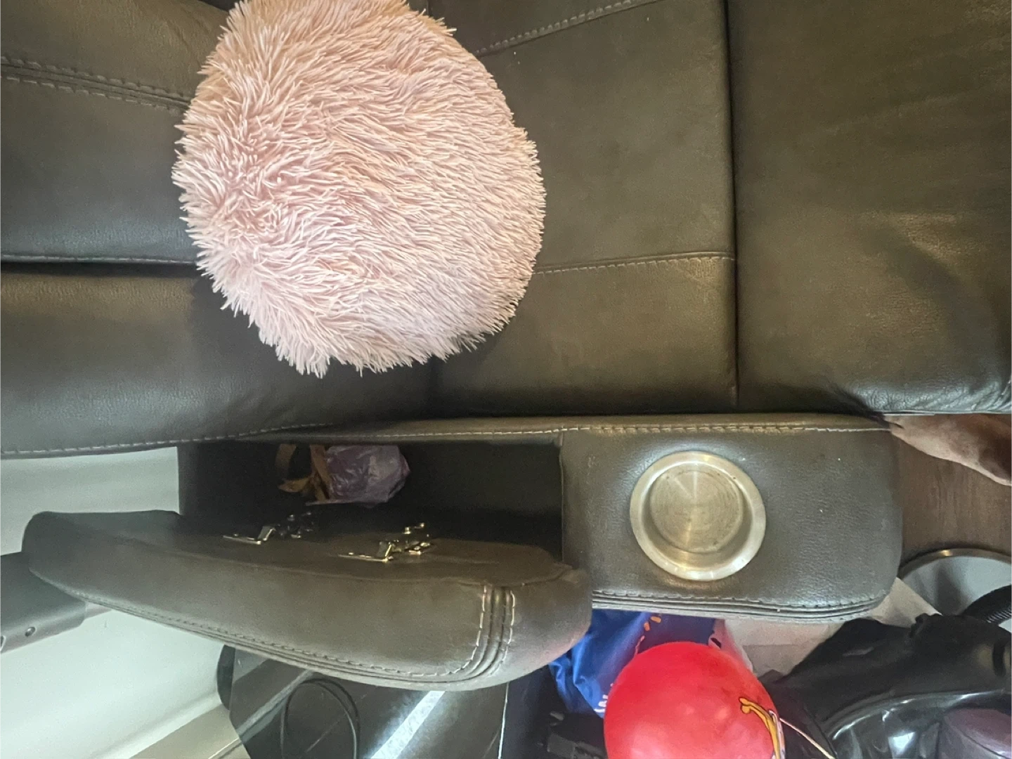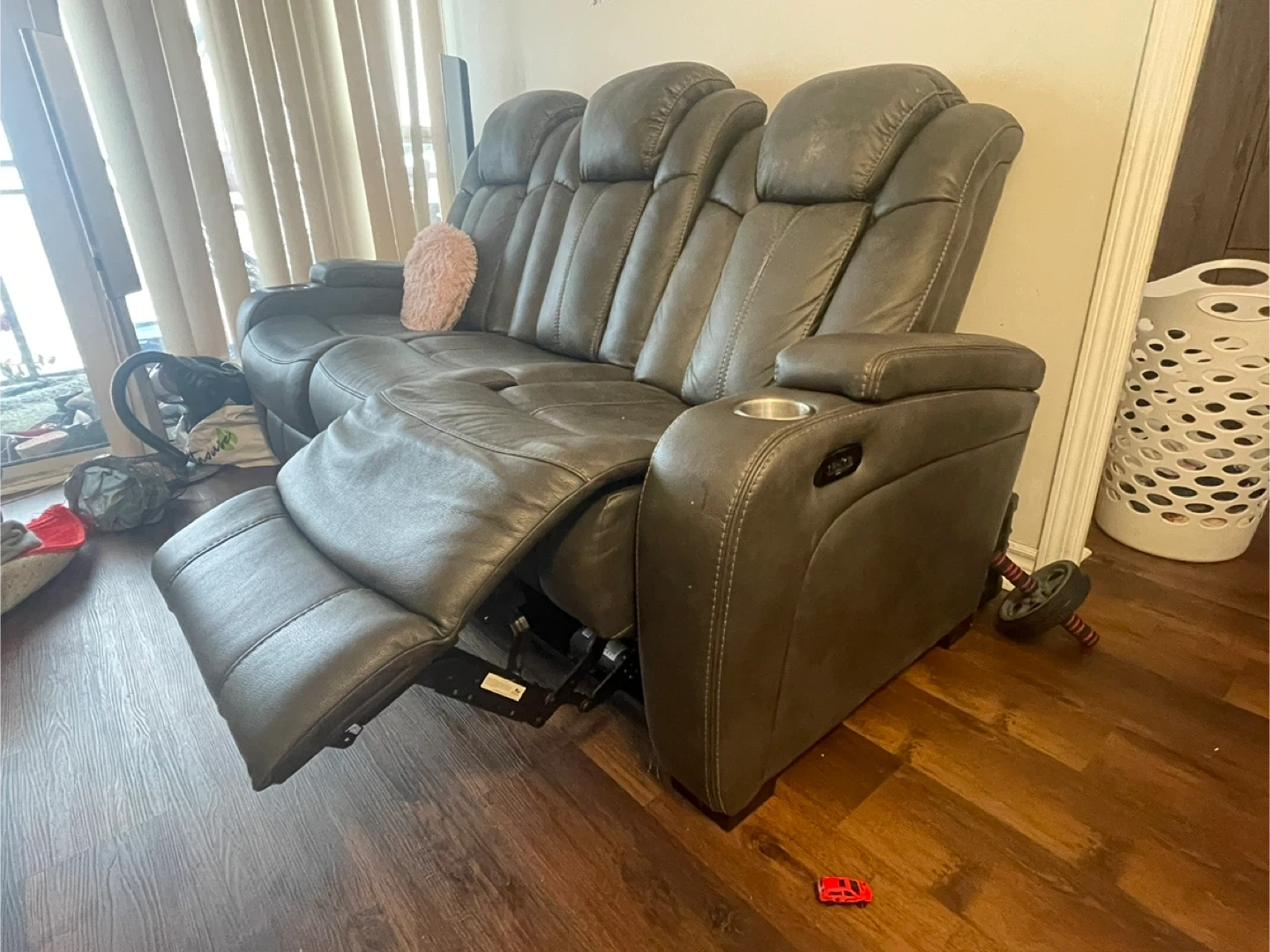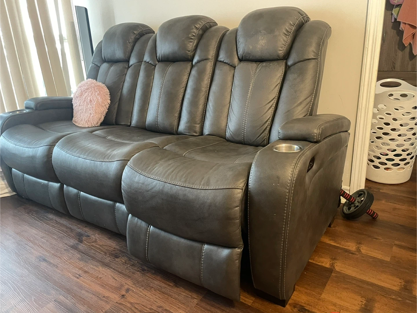 Selling a comfy three-seat reclining sofa! It's in a grey colour and features built-in cupholders on each end. Perfect for movie nights or just relaxing after a long day!