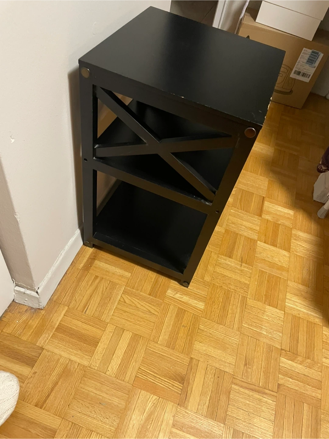 Selling a black end table that could also be used as a night stand. It has a sturdy design with two shelves for storage or display. Perfect for adding a touch of style and functionality to any room in your home!