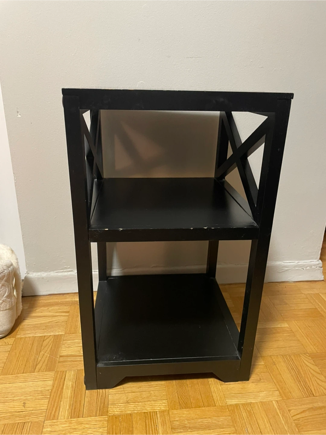 Selling a black end table that could also be used as a night stand. It has a sturdy design with two shelves for storage or display. Perfect for adding a touch of style and functionality to any room in your home!