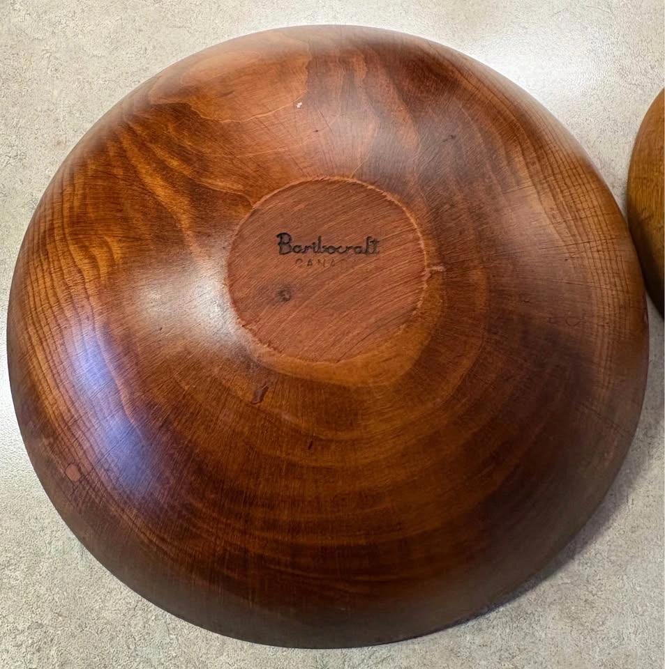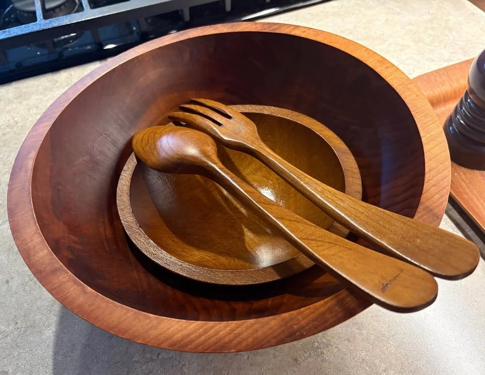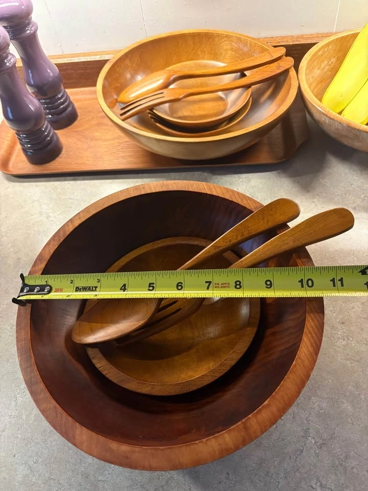 Used mainly as kitchen decor. The big bowl has minor signs of wear but still displays nicely. Smaller bowl and wooden utensils are included in the set. Beautiful 60βs-70βs retro vibes for your space. Pickup only in Burlington. Price is firm. Thank you.