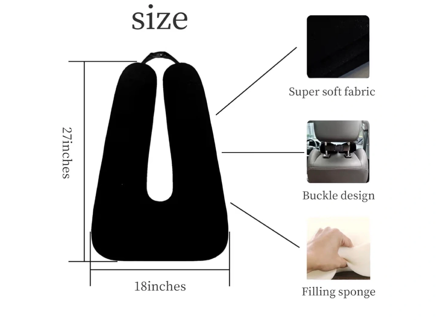 U-shaped travel pillow made with super soft fabric and filling sponge. It has a buckle design for secure attachment. Pillow measures 27 inches in height and 18 inches in width. It's designed for head and body support during car rides or flights.