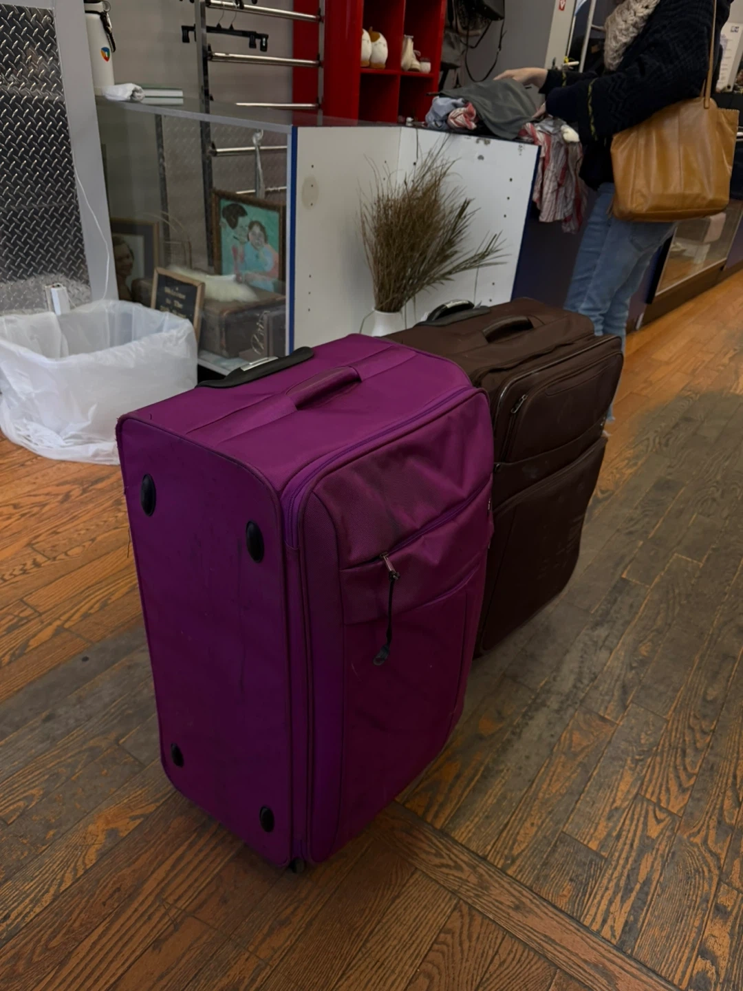 This set includes two rolling suitcases, one purple and one brown. Both have top handles and are made of fabric. They're great for travel! Dimensions: Purple suitcase is approximately 26 inches tall. Brown suitcase is approximately 24 inches tall.