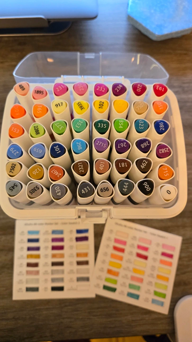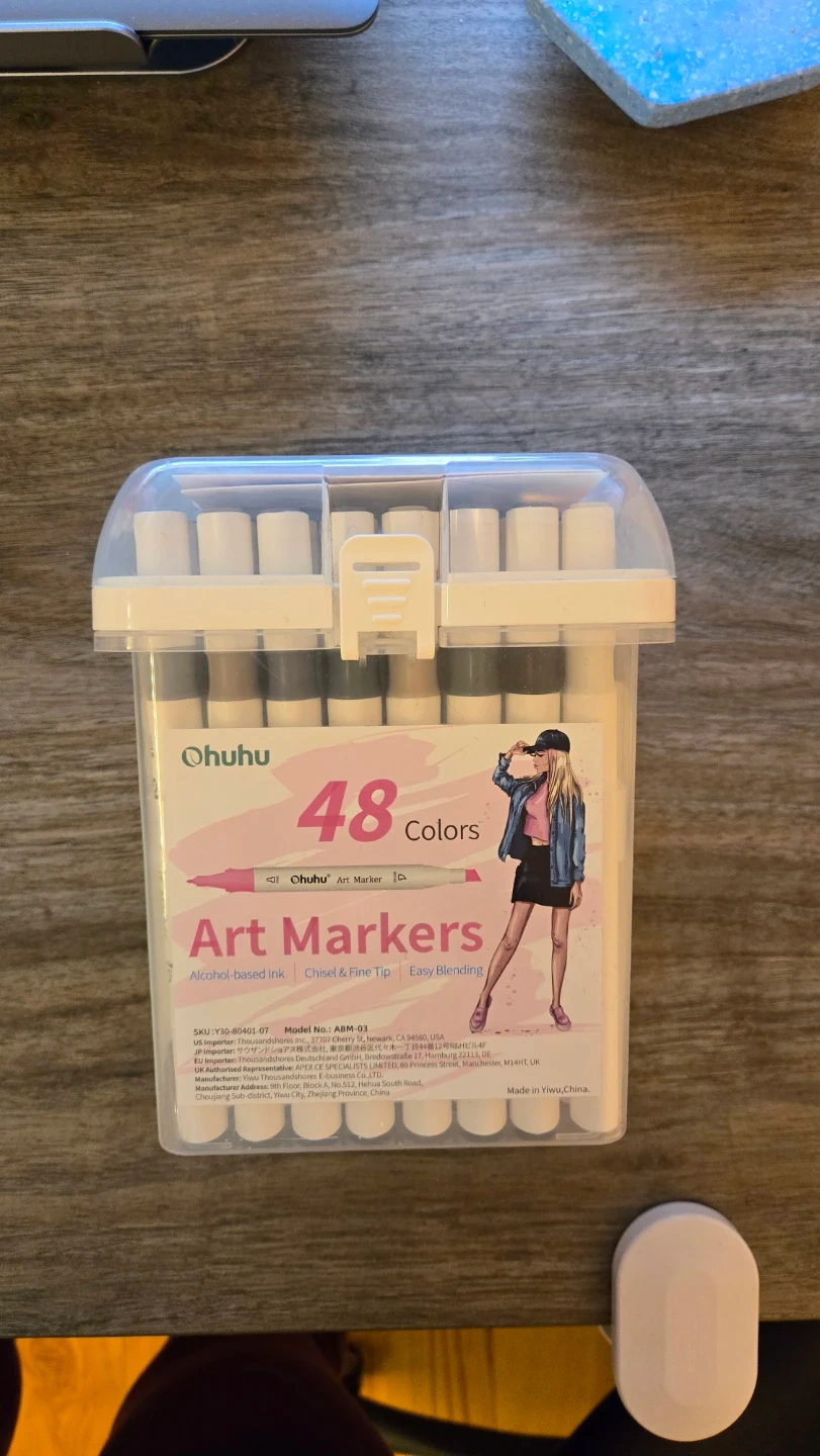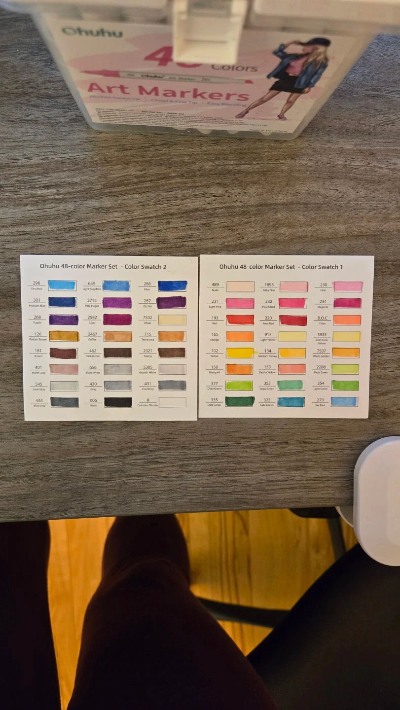 This set includes 48 Ohuhu art markers with chisel and fine tips. The markers are alcohol-based and come in a storage case with colour swatch cards. They're great for a variety of art projects!