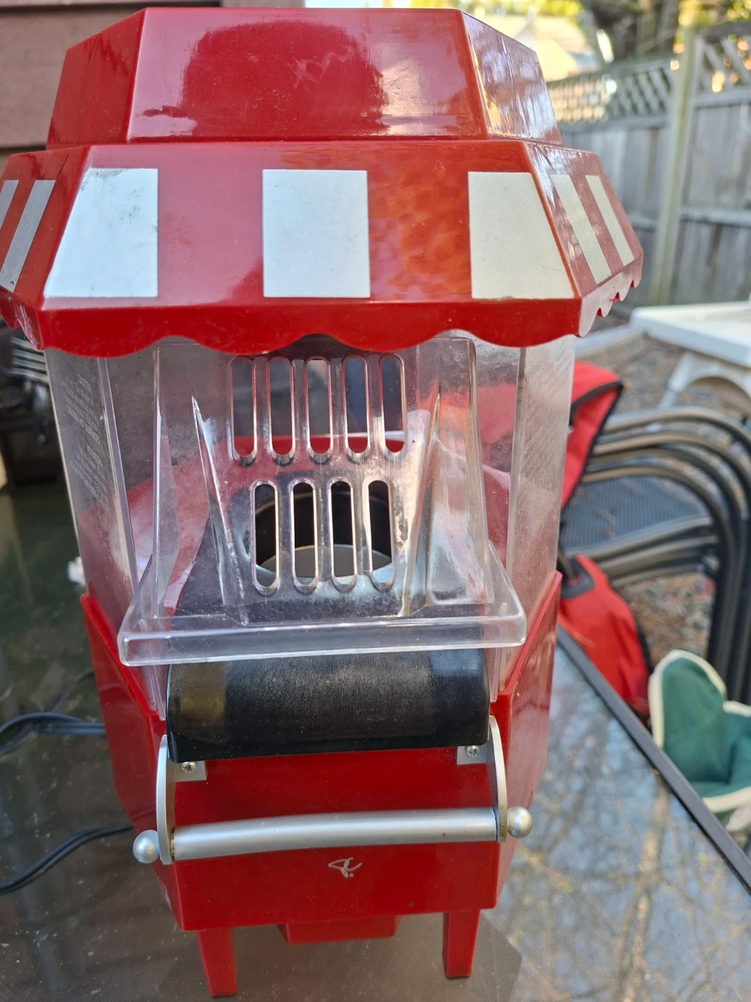 This red and clear popcorn machine brings a fun retro vibe to any movie night. It features a clear viewing window to watch the popcorn pop. The compact size makes it easy to store when not in use. Get ready for some tasty, fresh popcorn!