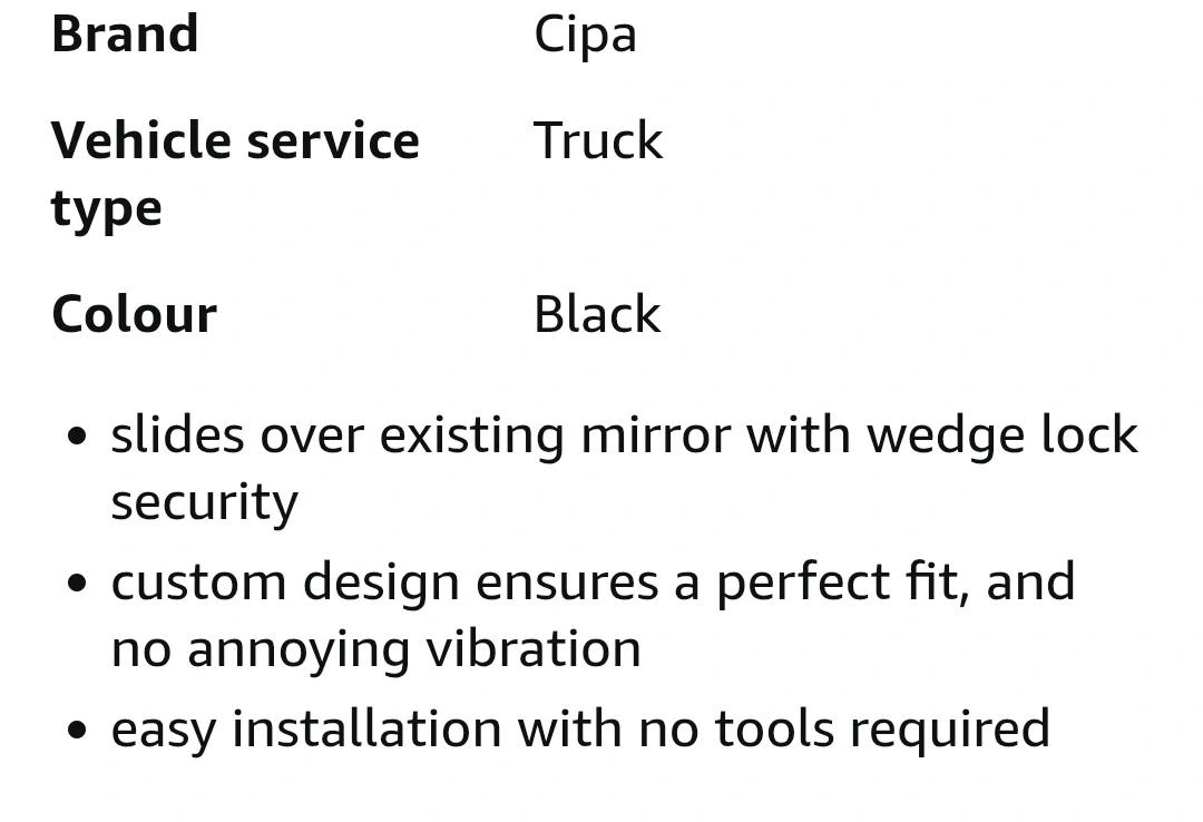 Enhance your towing capabilities with this Cipa 11550 custom towing mirror set for Ford F-150 trucks; practically brand new, these black mirrors easily slide over your existing mirrors with wedge lock security, ensuring a perfect fit without annoying vibration and easy installation, all without the need for tools.