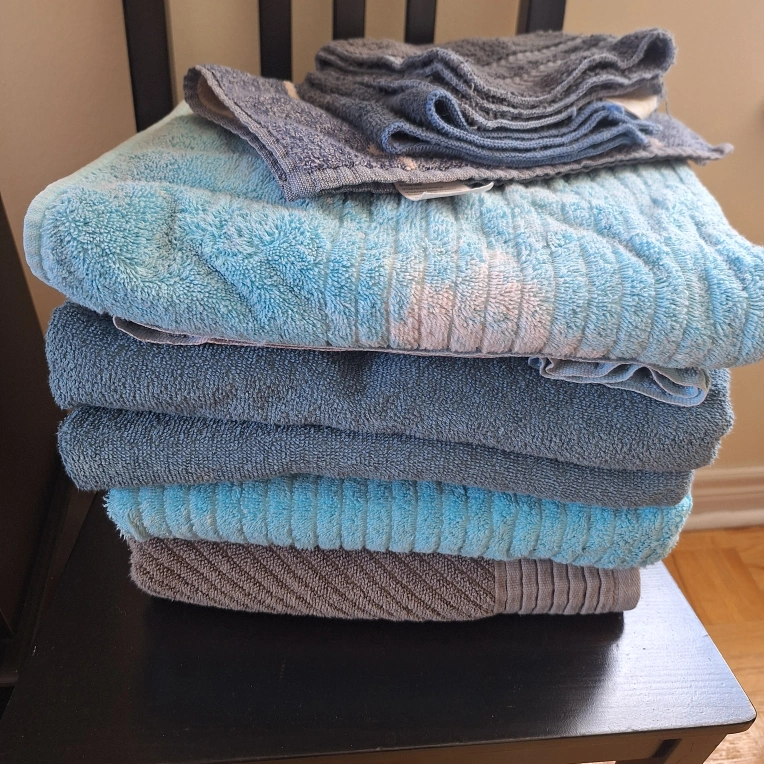 A bundle of towels, in various sizes and colours that have bleach and/or dye stains on them. Good for rags around the house or projects.